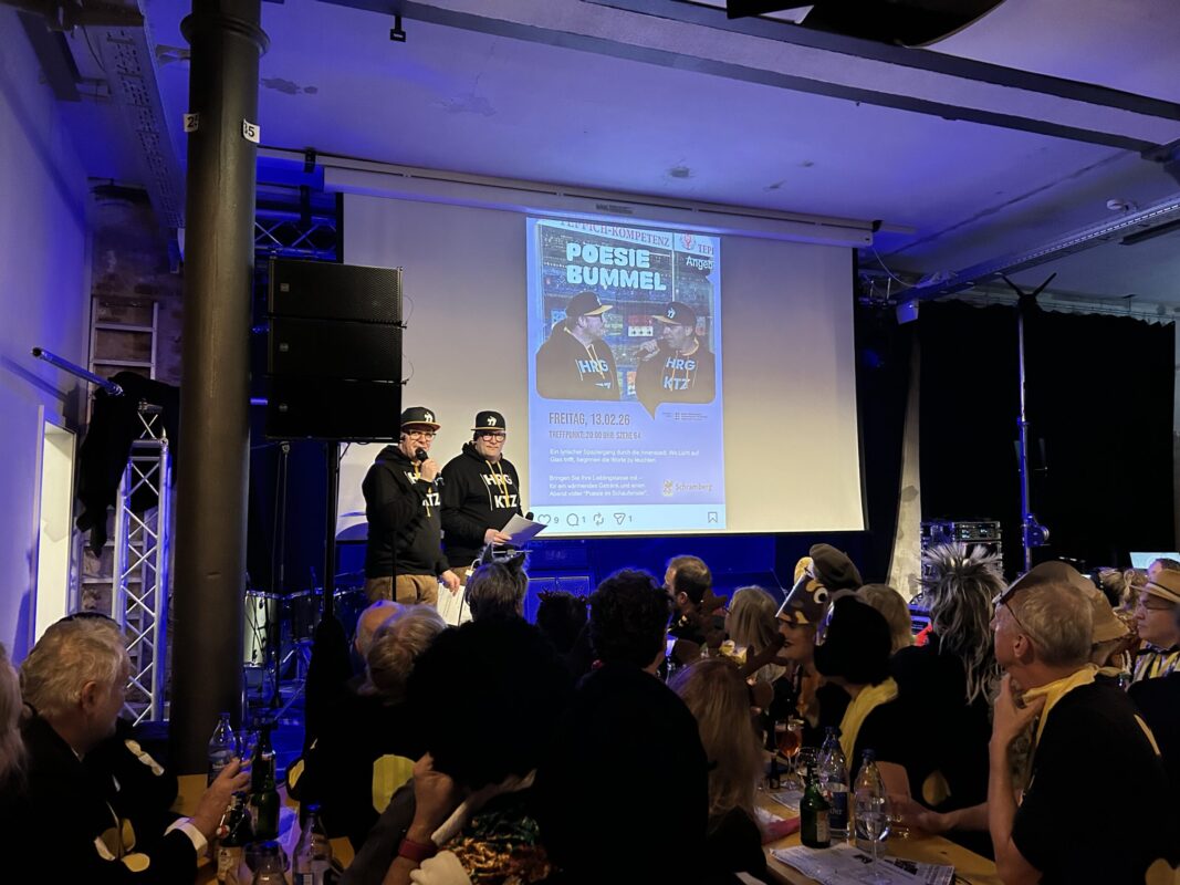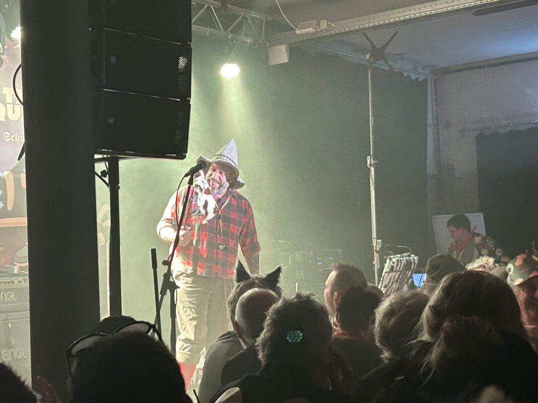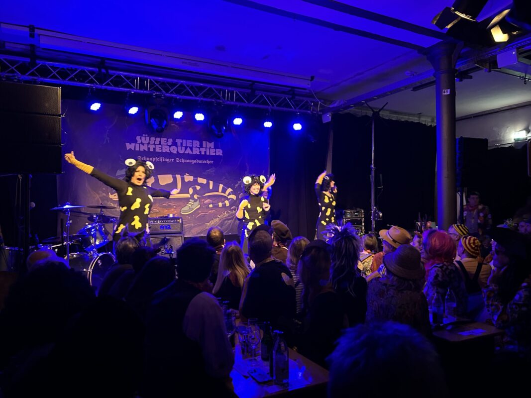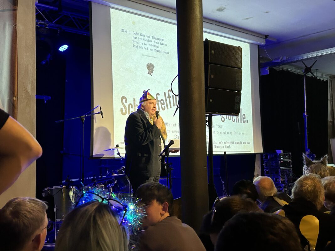 Das Zunftballett, bestehend aus Ina Bischof, Ines Faller-Langeneck, Katrin Mayer und Bea Letzin, trat in diesem Jahr dem Motto entsprechend als Salamander auf und tanzte unter anderem zum bekannten Lied „Bodo mit dem Bagger“. Im Anschluss startete eine Polonaise in der eng bestuhlten Szene 64, die die Pause bis zum nächsten Programmpunkt füllte. Zunftarchivar Carsten Kohlmann präsentierte im Anschluss die neue Postkarte, die einem „seltenen Jubiläum gewidmet ist. Denn nicht nur Schramberg habe seit 1876 ein Narrenblättle, sondern auch der am Hochrhein gelegene Ort Schnupfelfingen. Recherchen für das immaterielle UNESCO-Weltkulturerbe ergaben sogar, das alle Narrenblättle aus dieser Gründerzeit auf die Initiative von Fritz Würtz genannt „Krumbein“ zurückgingen, wie eine Ausstellung im Schnupfelfinger Fasnetsmuseum anschaulich zeige.