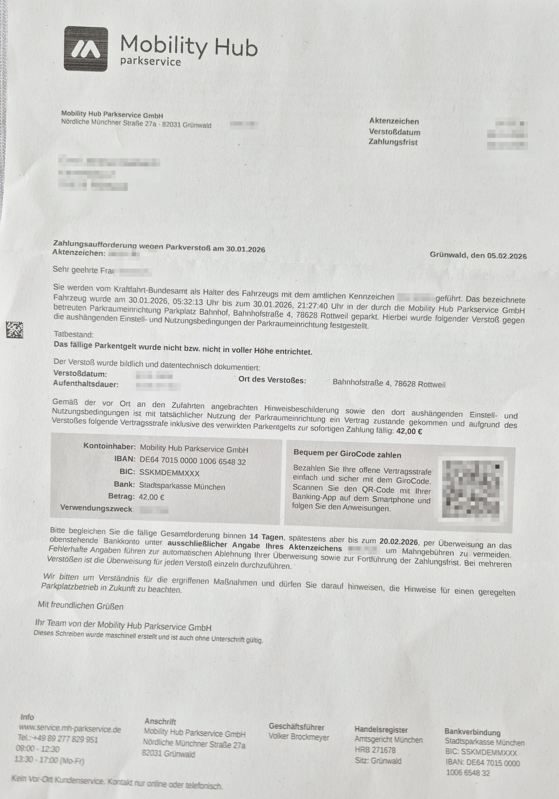 Mobility Hub: Wir können aus Datenschutzgründen keine konkreten Aussagen zu individuellen Fällen geben. Sehr gerne nehmen wir uns dem von Ihnen erwähnten Fall an, wenn die Leserin sich an unseren Kundenservice wendet. Dafür steht das Portal zur Verfügung, auf dem sich die Leserin mit Aktenzeichen und Kennzeichen einloggen und ihr Anliegen ganz einfach schildern kann. Den Link finden die Parkenden auch auf dem Schreiben mit der Zahlungsaufforderung: https://service.mh-parkservice.de/.