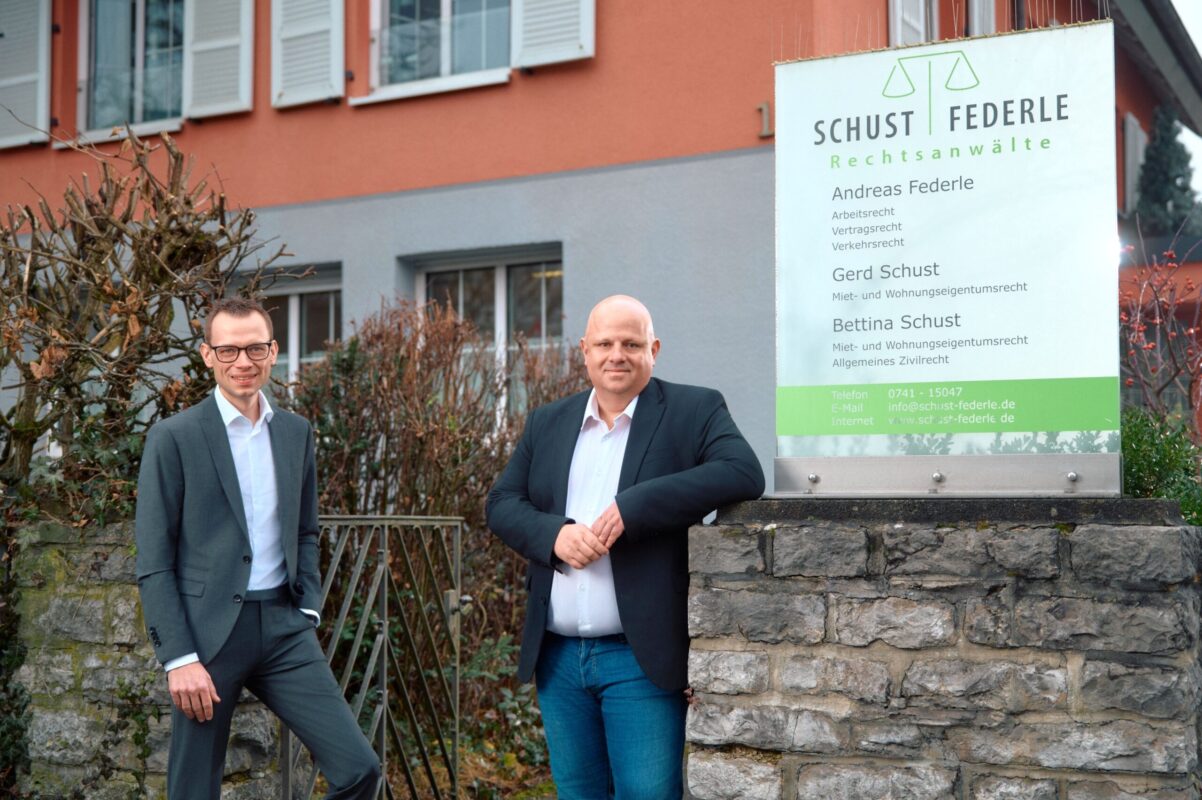 Die Kanzlei Schust & Federle mit Hauptsitz in Rottweil betreut Mandantinnen und Mandanten bundesweit mit Schwerpunkten im Arbeitsrecht, im Miet- und Wohnungseigentumsrecht sowie im Verkehrsrecht und hat umfassende Erfahrungen auch in weiteren Rechtsgebieten. Wert gelegt wird auf eine verständliche Sprache, faire und unabhängige Beratung und moderne Arbeitsweisen.
