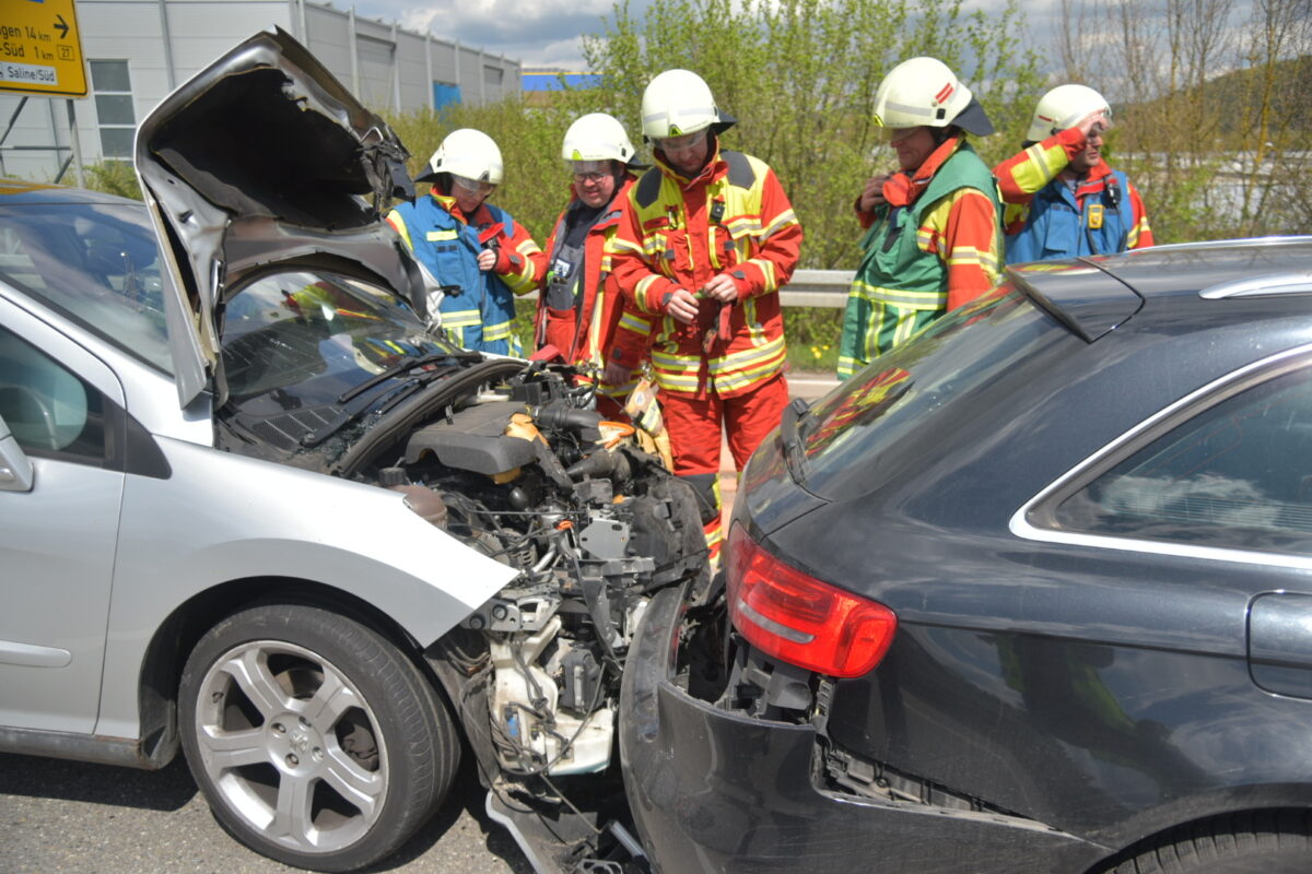 Die Zusammenstöße der Fahrzeuge untereinander müssen echt heftig gewesen sein, die Einsatzstelle ist mit Trümmerteilen der Autos übersät. Mutmaßlich geschah der Unfall, als einer der Wagen auf die B14 auffahren wollte. Nähere Informationen dazu liegen allerdings noch nicht vor.