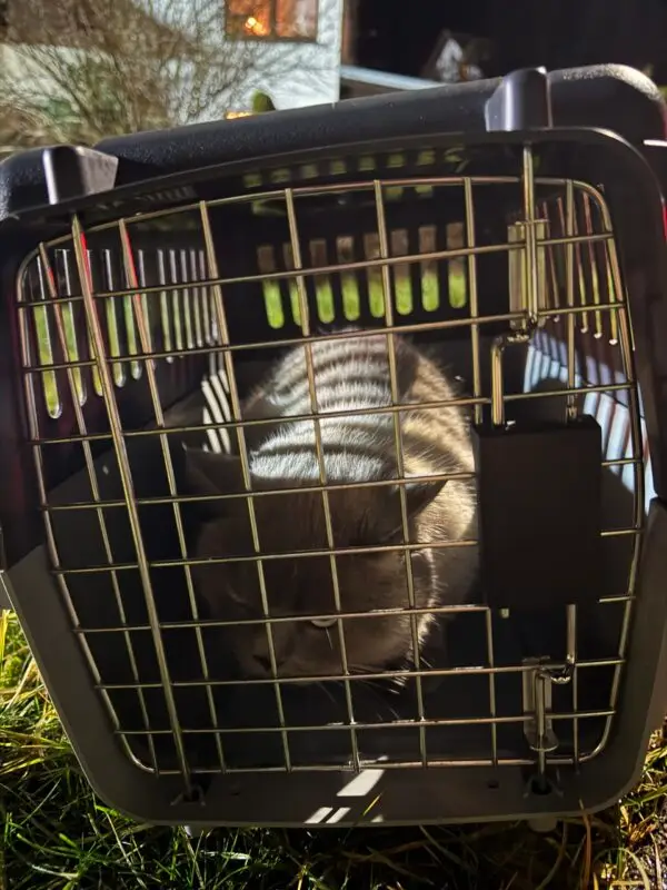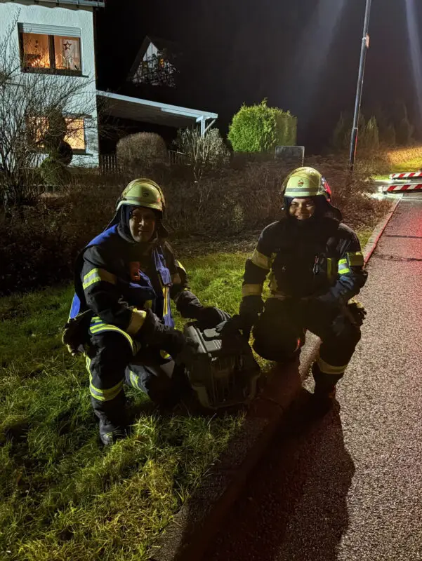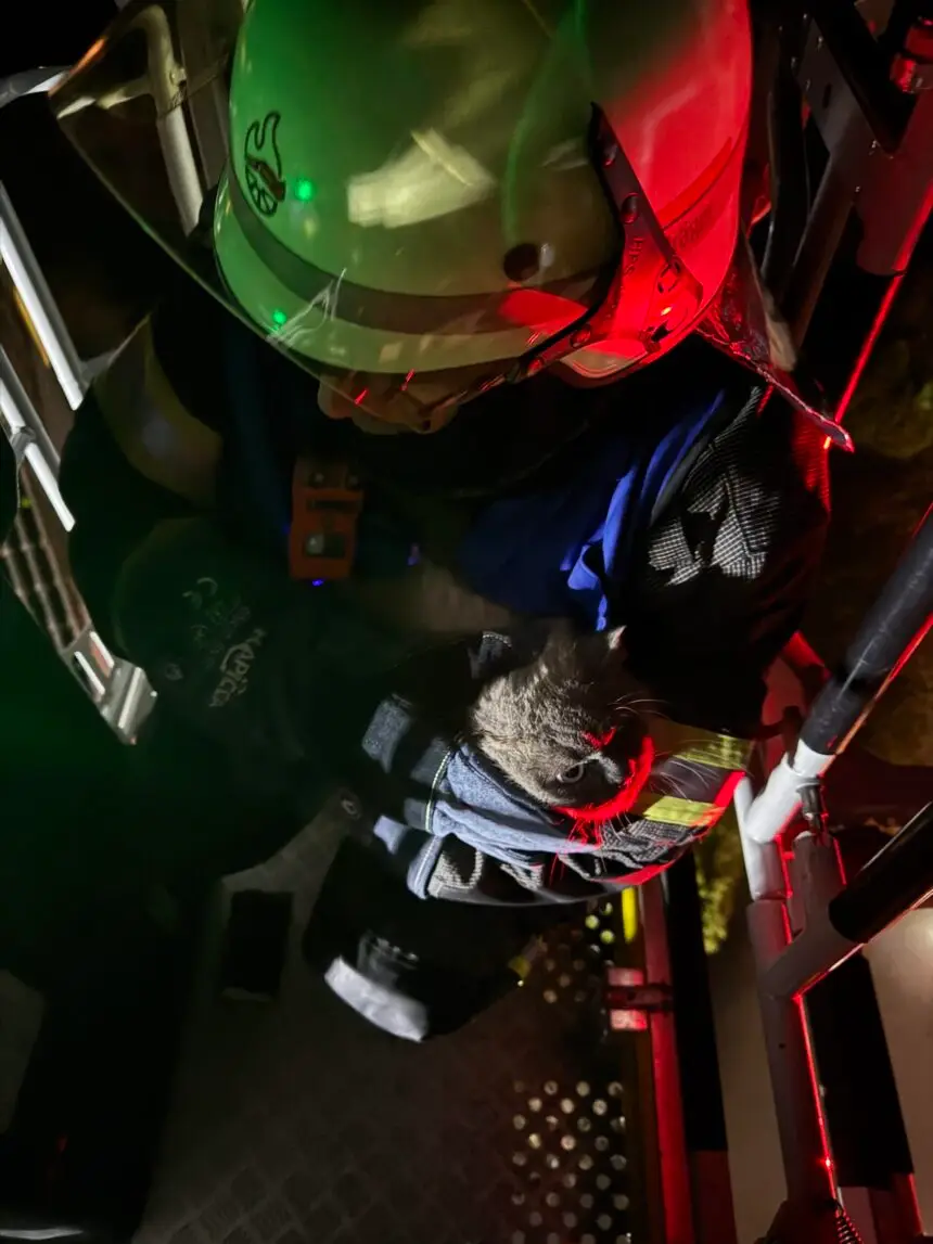 Dort konnte sie ein Feuerwehrmann in seine Obhut nehmen. Im Drehleiterkorb wurde diese dann bis auf den Boden gebracht. Am Boden wurde die augenscheinlich unverletzte Katze dann in eine Transportbox gelegt.