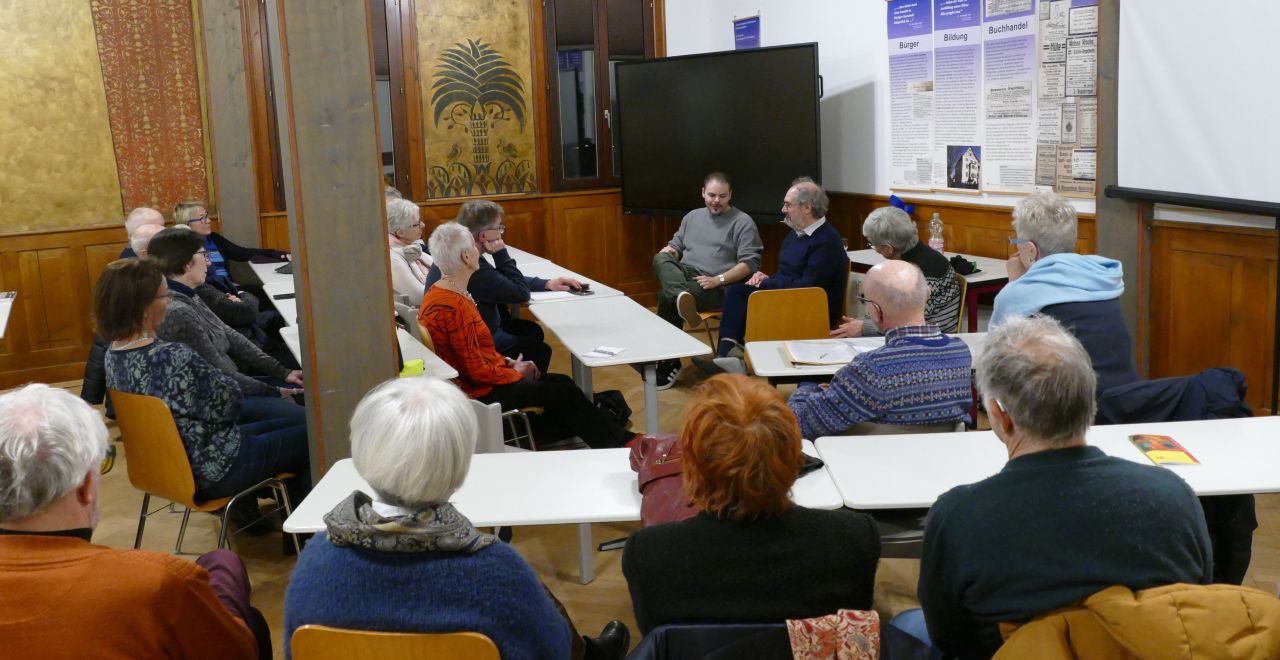In den Betsaal der ehemaligen Synagoge sind viele gekommen, um dieses Dialogangebot anzunehmen und Neues oder Tradiertes über die beiden Weltreligionen Judentum und Islam zu erfahren. Seit dem siebten Oktober 2023 gehen die beiden Referenten auf Menschen unterschiedlichen Alters zu, auf Konfirmanten (in Rottweil am gleichen Tag) auf Senioren oder Vereine, die sich um Aufarbeitung jüdischer und muslimischer Geschichte in Deutschland bemühen. Der interreligiöse Dialog ist ihnen wichtig , und so wurde der Abend zu einem lebendigen Austausch auf Augenhöhe.