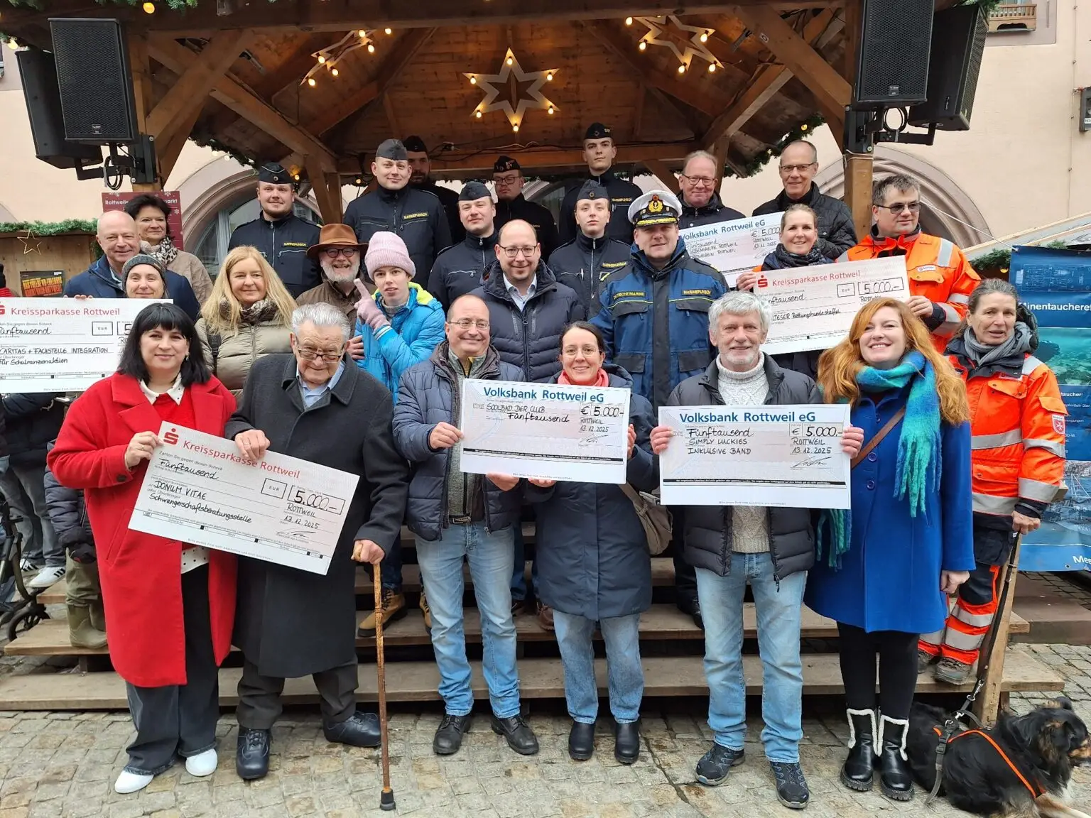 Insgesamt kam eine Spendensumme von 41.220 Euro zusammen. Jeweils 5000 Euro erhielten die Malteser-Rettungshundestaffel, die Schwangerschaftsberatungsstelle Donum Vitae, die inklusive Band Simply Luckies, die Bürgerinitiative Soolbad, die Caritas und die Fachstelle Integration für die gemeinsame Schulranzenaktion sowie der Lebenshilfe-Ortsverein Rottweil. Da am letzten Wochenende nochmals fleißig Marinepunsch ausgeschenkt wurde, konnten zusätzlich weitere Einrichtungen berücksichtigt werden: Der DRK-Tafelladen, die Wärmestube sowie Frauen helfen Frauen und Auswege e. V. erhielten jeweils 3740 Euro. Darüber berichtet die Stadtverwaltung.