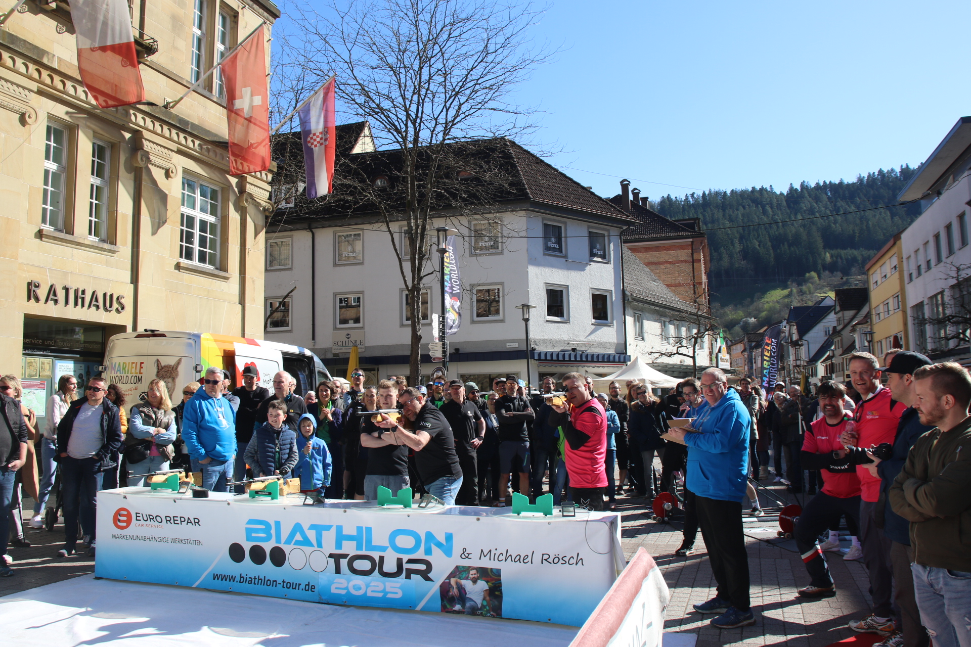 Schramberg. Biathlon erleben wie im Fernsehen – nur mitten in der Stadt: Am Sonntag, 19. April, verwandelt sich der Rathausplatz in Schramberg in eine mobile Biathlon-Arena. Beim Citybiathlon der Deutschland-Tour dürfen Besucher selbst antreten, ihre Treffsicherheit testen und sogar um den Einzug ins Finale in Oberhof kämpfen.