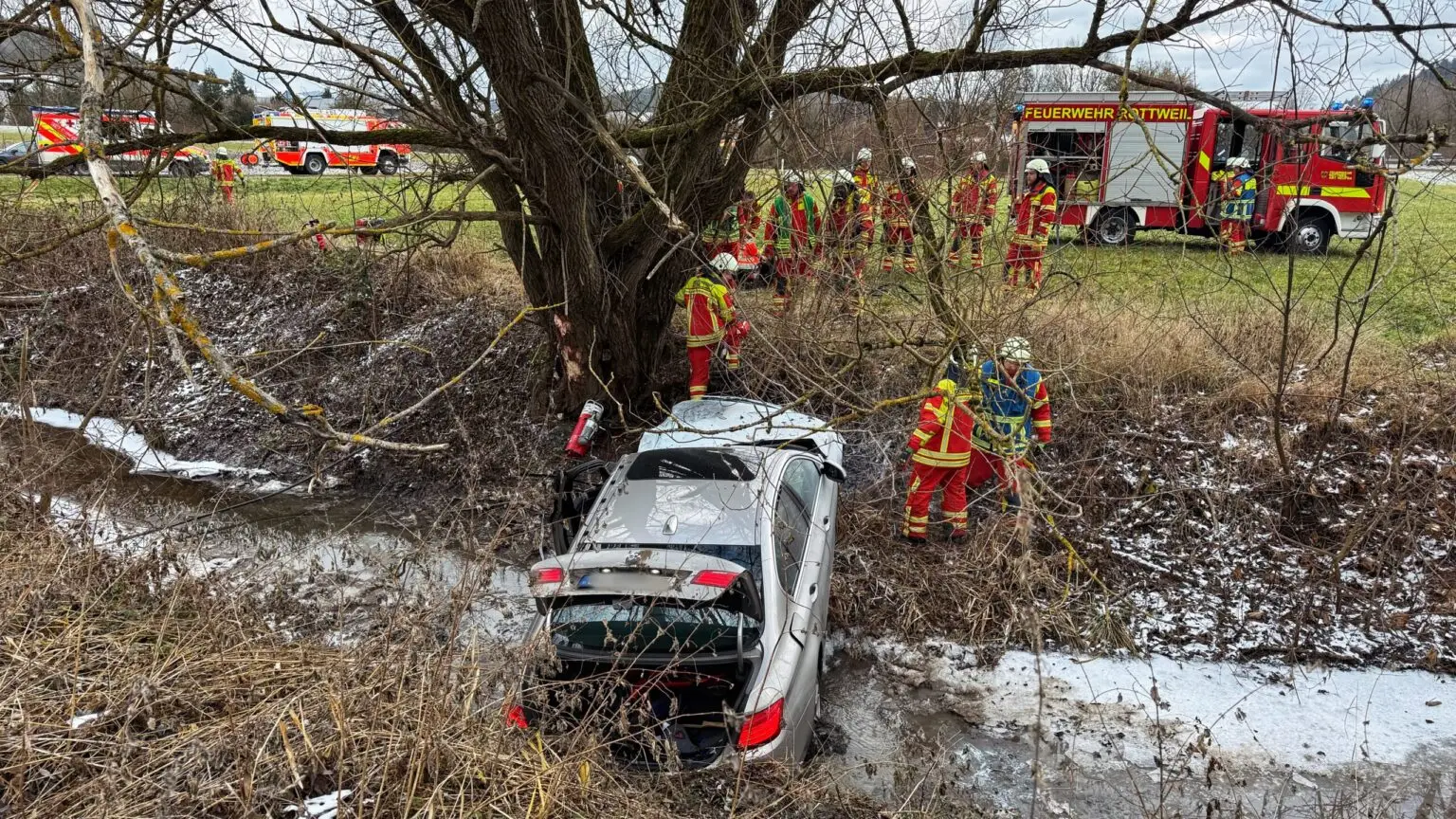 Bei einem schweren Unfall ist am Dienstagnachmittag ein Senior verletzt worden. Er war mit seiner Limousine in einem kleinen Bach bei Rottweil-Neufra gelandet – und das aus bislang ungeklärten Gründen. Ein Ersthelfer musste ebenfalls medizinisch versorgt werden. Bei ihm und weiteren Helfern bedankt sich die Polizei ausdrücklich.