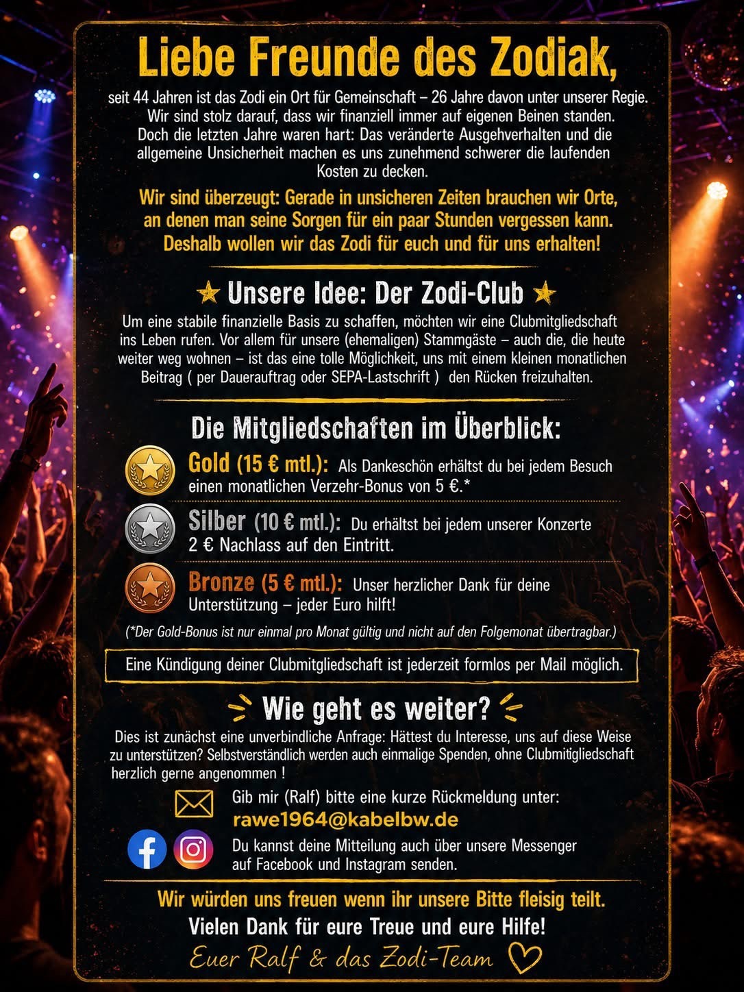 Auffällig ist die breite Zustimmung quer durch die Community – von langjährigen „Top-Fans“ bis hin zu regelmäßigen Gästen. Kommentare wie „Ich bin natürlich auch dabei!!“ (Mike Boom), „Ich würde euch unterstützen!“ (HP Walter) oder „Super Idee. Ich bin dabei“ (Jo Glaser) zeigen: Das „Zodiak“ kann offenbar auf einen festen Rückhalt bauen.
