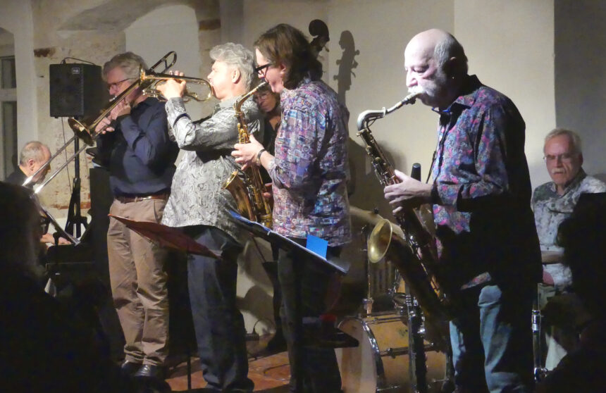 Verschroben, verschoben, verwoben schichten sich da Themen und Melodien auf- und nebeneinander, jubeln Kornett (Hans-Peter Ockert) und Saxofon (Alt Magnus Mehl, Tenor Martin Keller), Blassklarinette (Keller) und Posaune (Ian Cumming) einander zu, um alsbald in ächzendes Wehklagen zu kippen, zu verharren, zu verstummen und dann neuerlich in irrwitzigen Läufen loszubrechen.