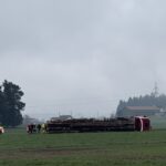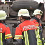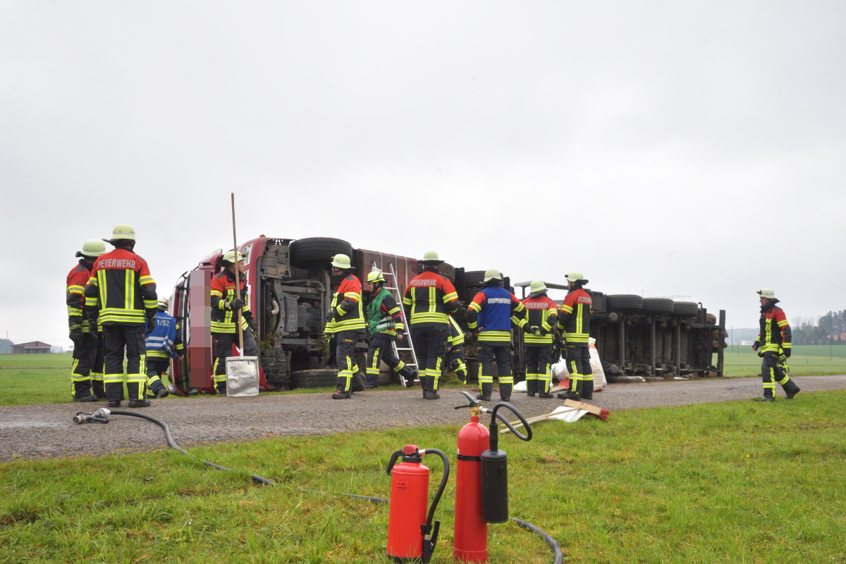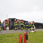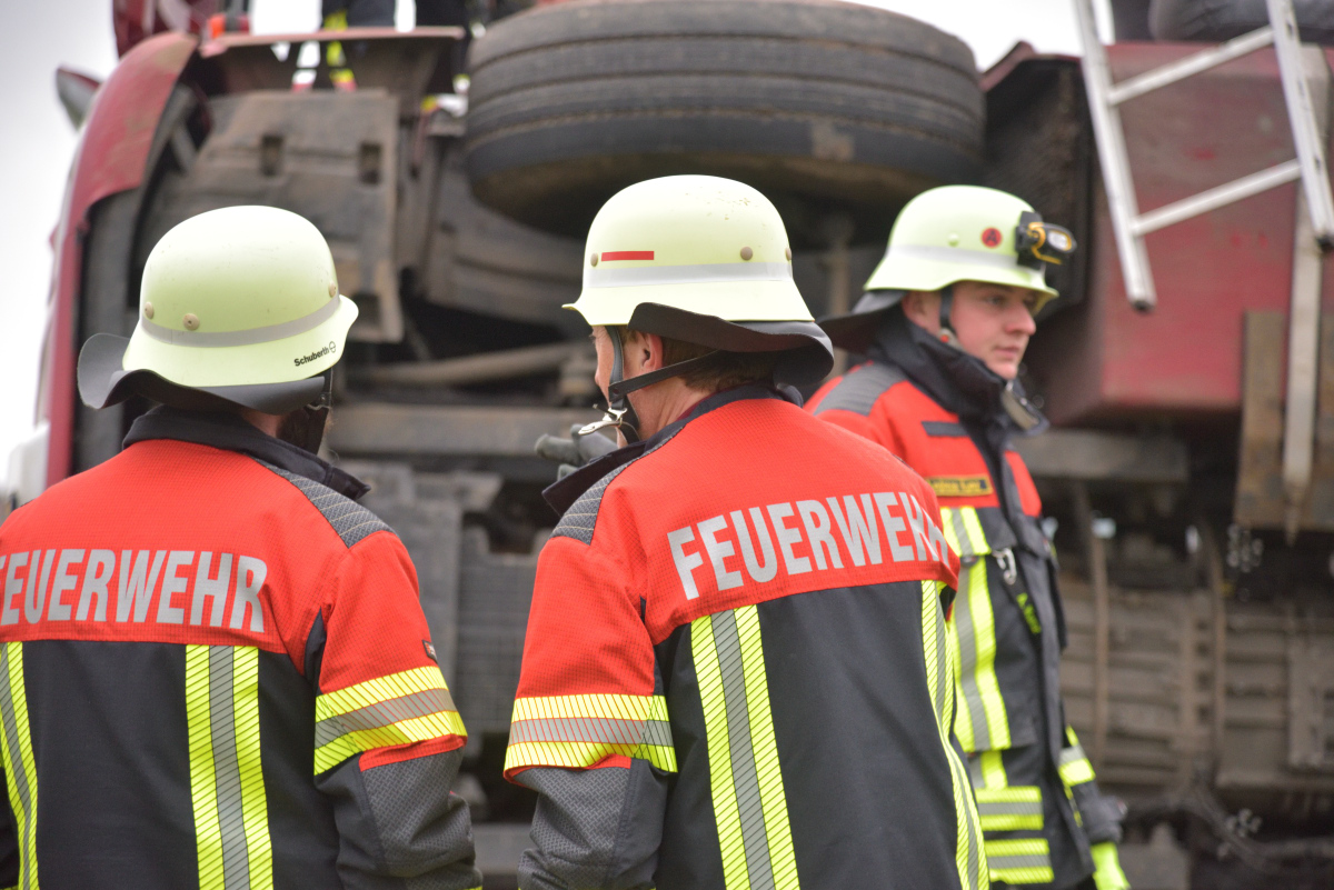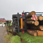 Schwierigkeiten wird jedoch die Rettung des LKW mit sich bringen. Zunächst müssen die schweren, durch zwei Gurte bislang gesicherten Stämme, die er geladen hat, entladen werden, ehe der LKW wieder aufgerichtet werden kann. Die vor Ort befindlichen Einsatzkräfte erörtern hierzu bzw. zu dem Vorgehen. Auch wird der Laster als nicht mehr fahrbereit angesehen. Es ist notwendig, ihn zu bergen und abzuschleppen. Die Arbeiten mit Holz sind gestoppt worden. Berichten zufolge wird es noch mehrere Stunden dauern, bis der LKW geborgen ist und der Einsatz der Feuerwehr beendet ist.
