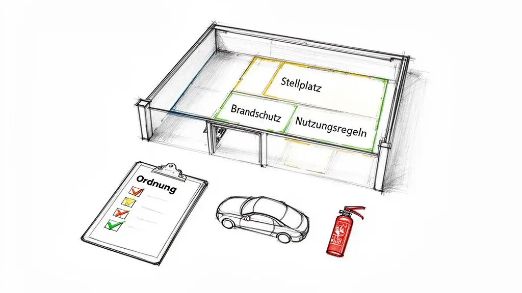 Eine Garage in Baden-Württemberg ist weit mehr als nur vier Wände und ein Dach. Sie ist ein Bauwerk, das klaren gesetzlichen Spielregeln folgen muss. Genau diese Regeln sind das Fundament, auf dem jede gute Garagenordnung für Baden-Württemberg steht. Sie geben vor, was rechtlich ein Muss ist und wo man als Eigentümergemeinschaft oder Betreiber noch selbst gestalten kann.