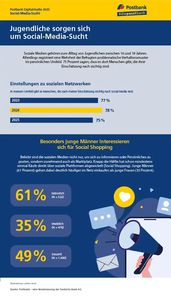 Jugendliche setzen sich zunehmend kritisch mit der Social-Media-Nutzung auseinander. Drei Viertel der 16- bis 18-Jährigen haben in ihrem persönlichen Umfeld Freunde, die sie für süchtig nach sozialen Medien halten. Junge Frauen (82 Prozent) nehmen diese Gefahr deutlich stärker wahr als junge Männer (68 Prozent). Das sind Ergebnisse der repräsentativen „Jugend-Digitalstudie 2025“ der Postbank.
