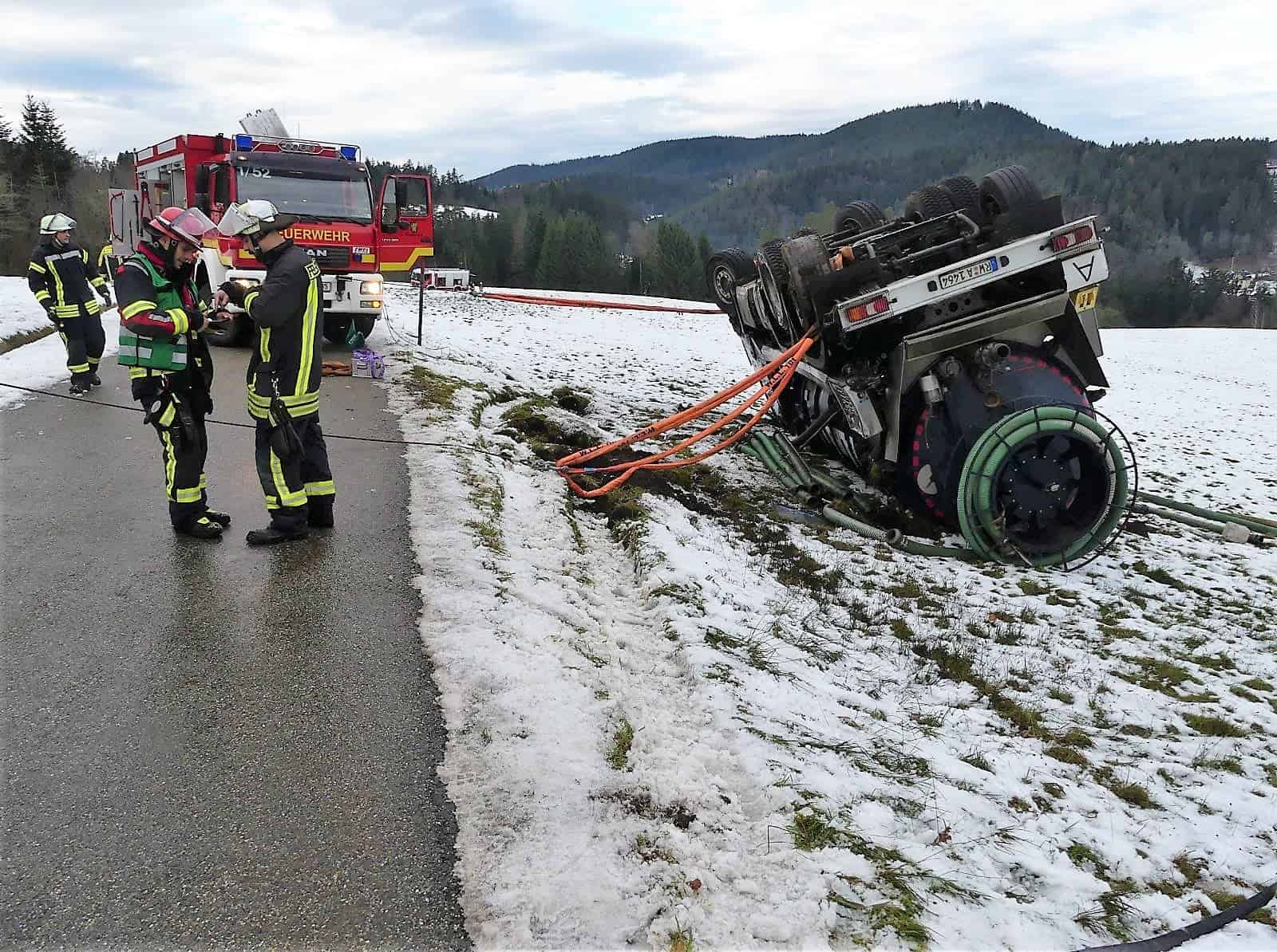 „Der Fahrer wurde nur leicht verletzt“, berichtet der Sprecher der Kreisfeuerwehr Sven Haberer. Der Fahrer war mit seinem Fahrzeug etwas zu weit rechts geraten und ist dann auf dem schneebedeckten Randstreifen weggerutscht.