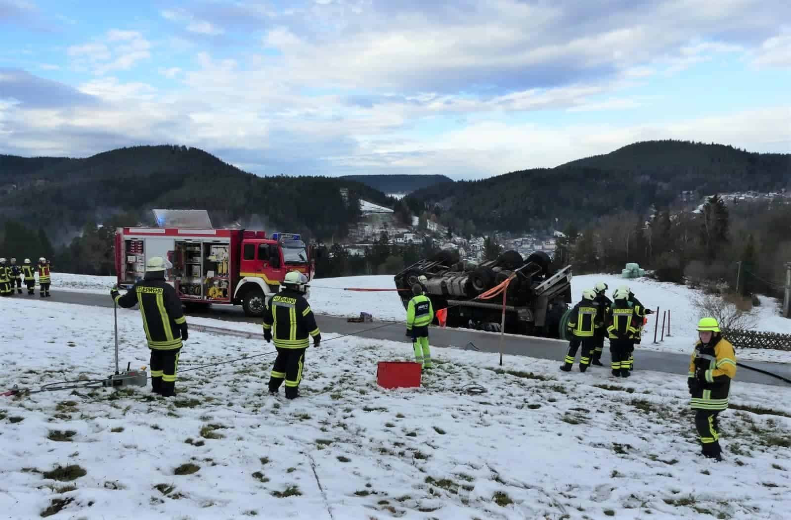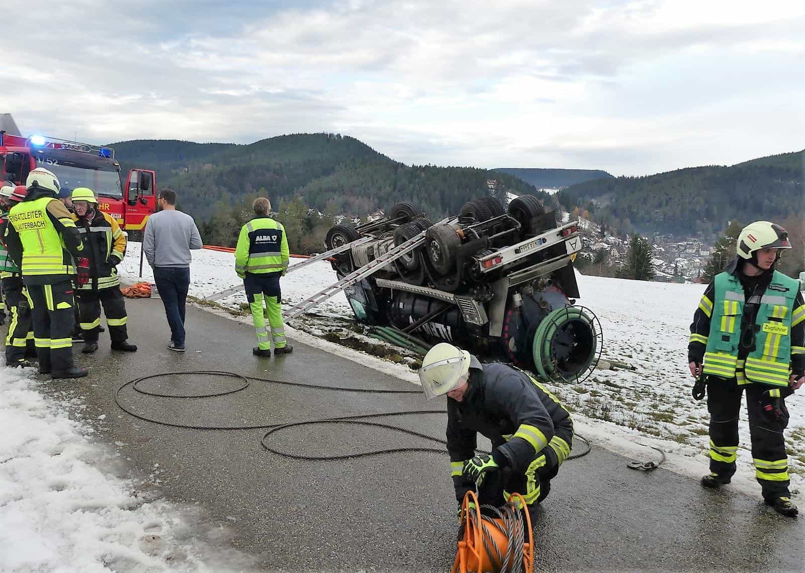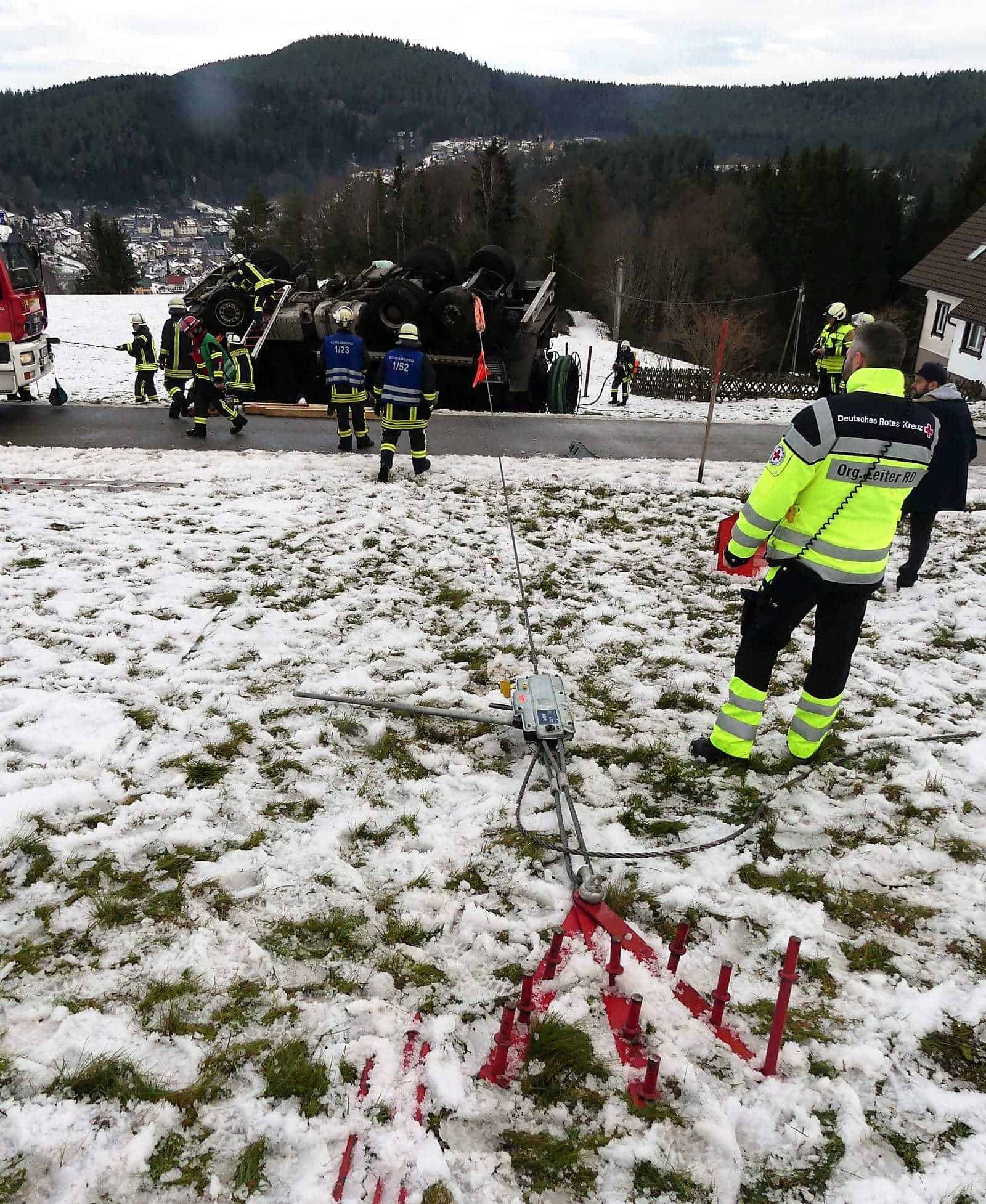 Die Feuerwehrleute aus Lauterbach und Schramberg-Tal haben das Fahrzeug so gesichert, dass es nicht weiter abrutschen konnte. Ein weiteres Kanalfahrzeug sei angefordert, um die Fäkalien aus dem Unglücksfahrzeug abzupumpen, so Storz. Für die eigentliche Bergung werde ein Spezialkran kommen.