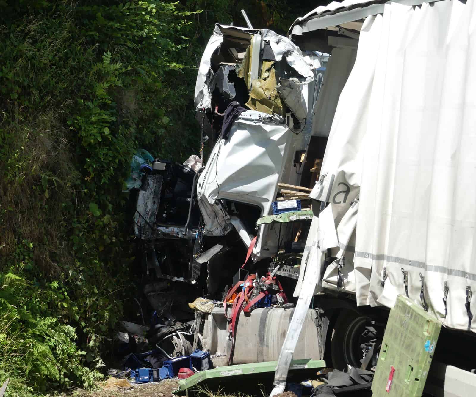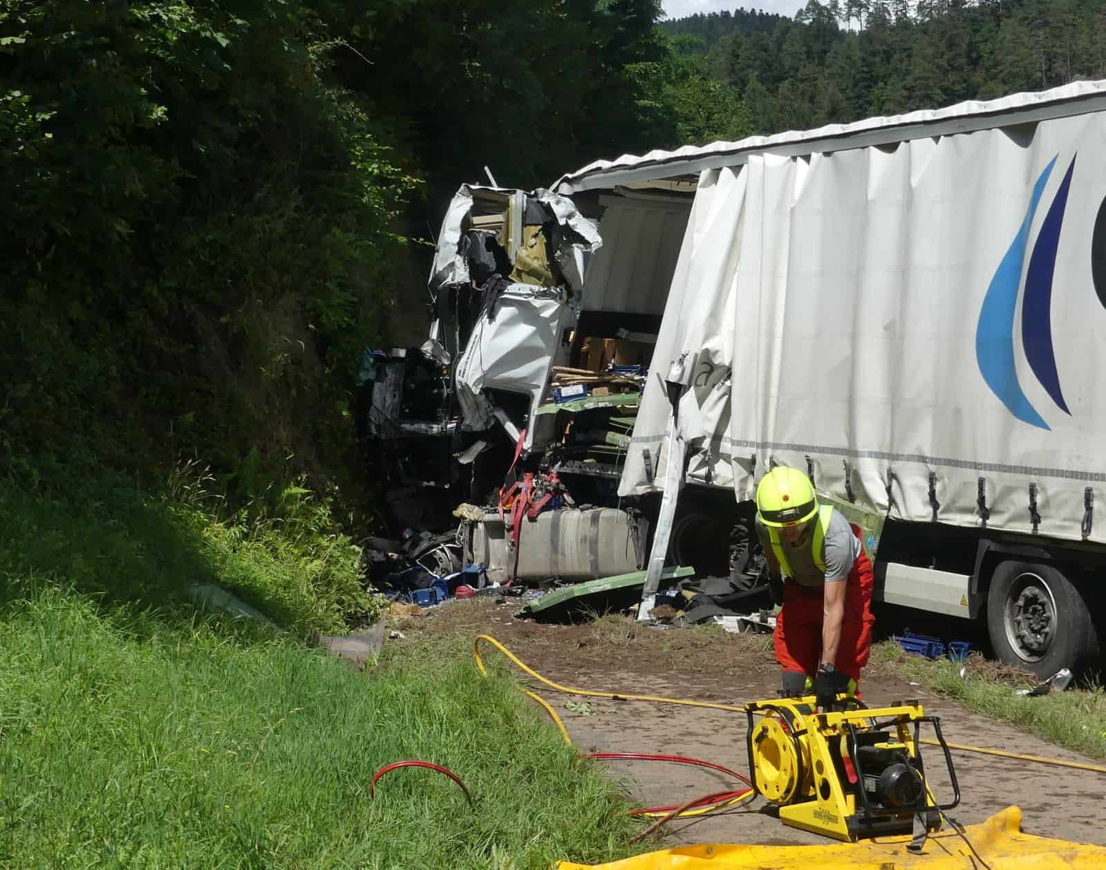 Laut Feuerwehrsprecher Danny Barowka war die Rettung des lebensgefährlich verletzten Fahrers aus seiner total zertrümmerten Fahrerkabine sehr schwierig: “Wir mussten zwei Rettungssätze einsetzen.“
