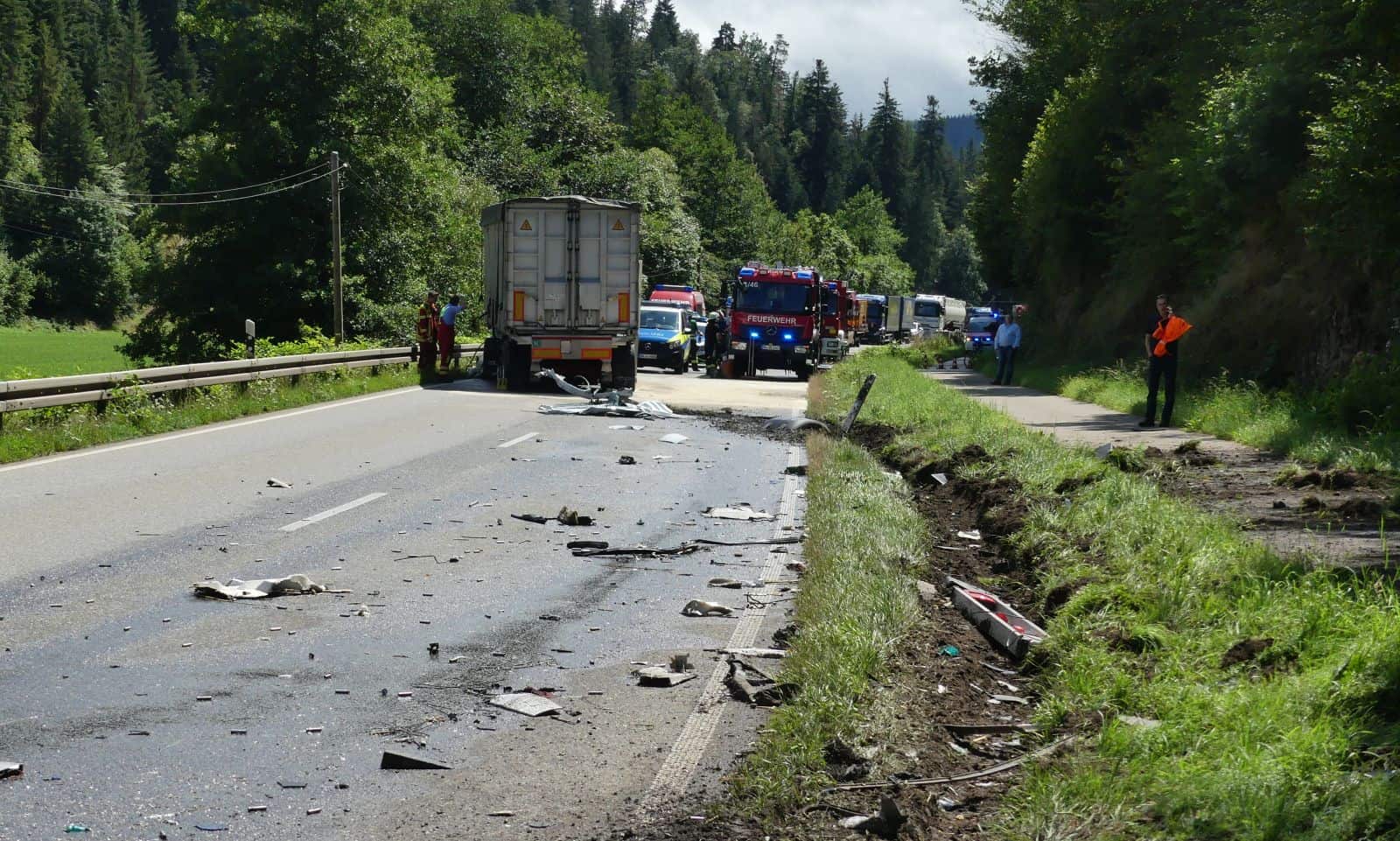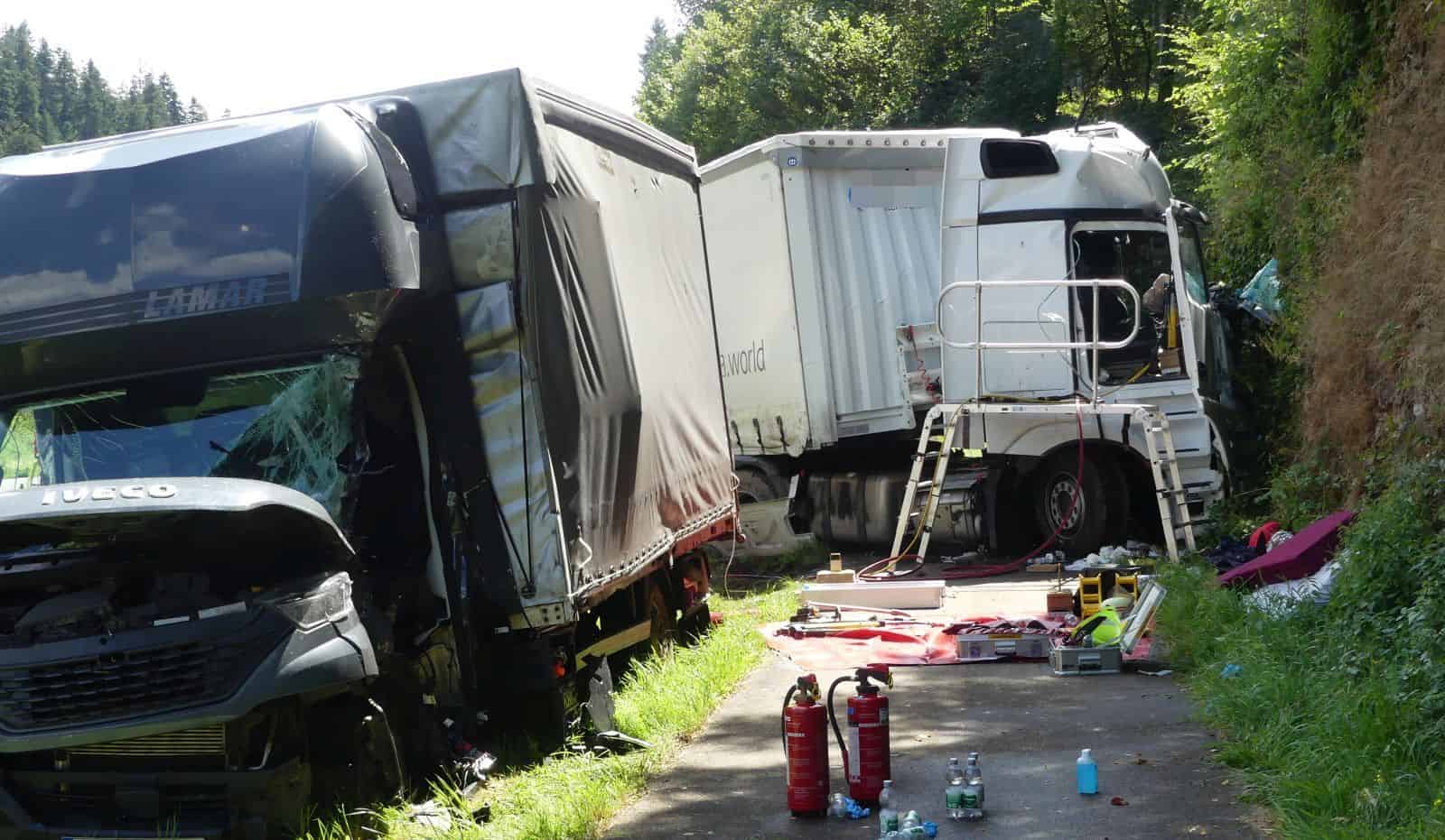 Den Einsatzkräften bot sich ein Trümmerfeld. Zwei Sattelschlepper sind aufeinandergeprallt. Einer der beiden hat dann noch einen kleineren Transporter erfasst. Über die Unfallursache ist noch nichts Näheres bekannt. Der Fahrer des LKW, der aus Richtung Schramberg kam, war wohl auf die Gegenfahrbahn geraten und ist dort mit dem anderen LKW kollidiert. Der LKW kam schließlich von der Fahrbahn ab und prallte gegen eine Felswand. Dabei hat der Fahrer sich lebensgefährlich verletzt. Die Fahrer im anderen LKW und im Transporter verletzten sich schwer. Video hier.