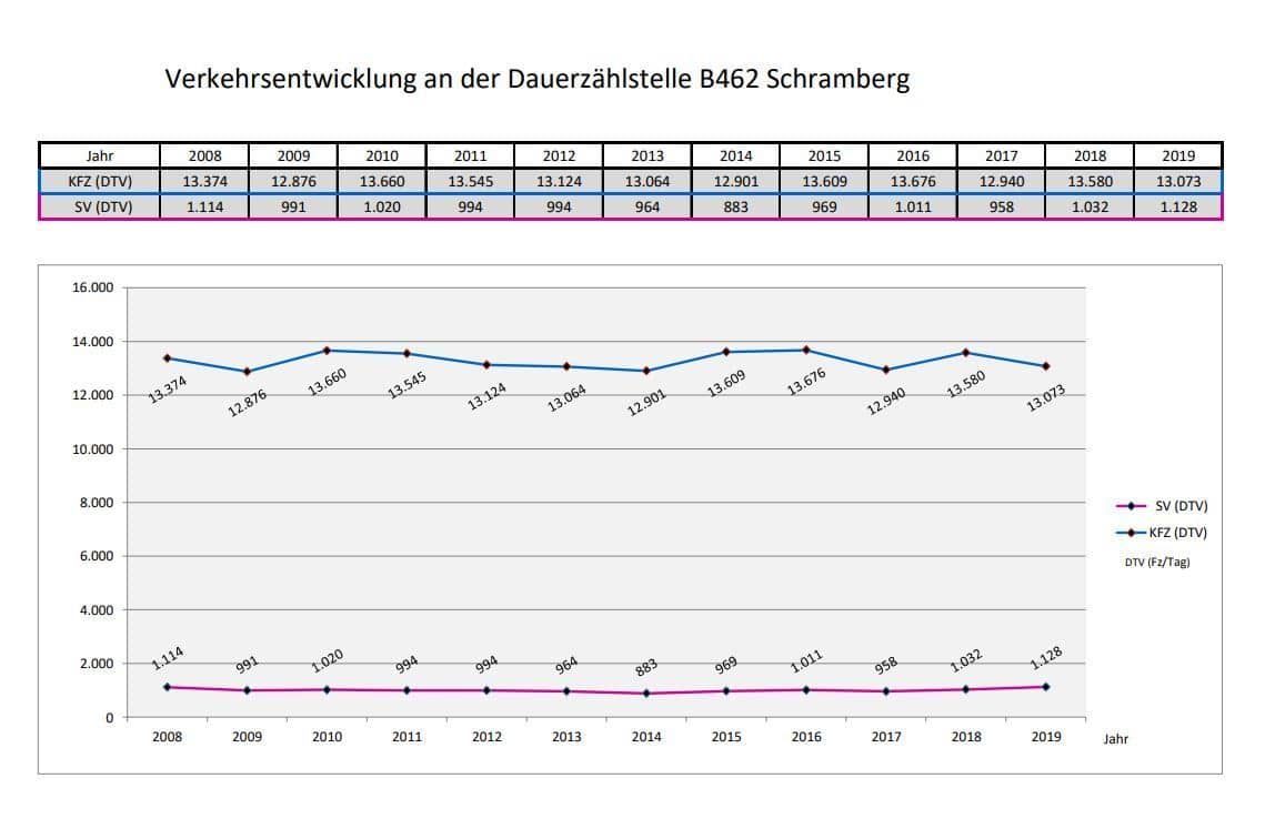 Bei der Talumfahrung Schramberg geht der Bundesverkehrswegeplan von einer prognostizierten Verkehrsbelastung von 19.600 Fahrzeugen (Autos und LKW) auf der Oberndorfer Straße im Jahr 2020 aus. Tatsächlich lag die Zahl im vergangenen Jahr bei 14.200 – nahezu unverändert seit Beginn der Zählung im Jahr 2007.