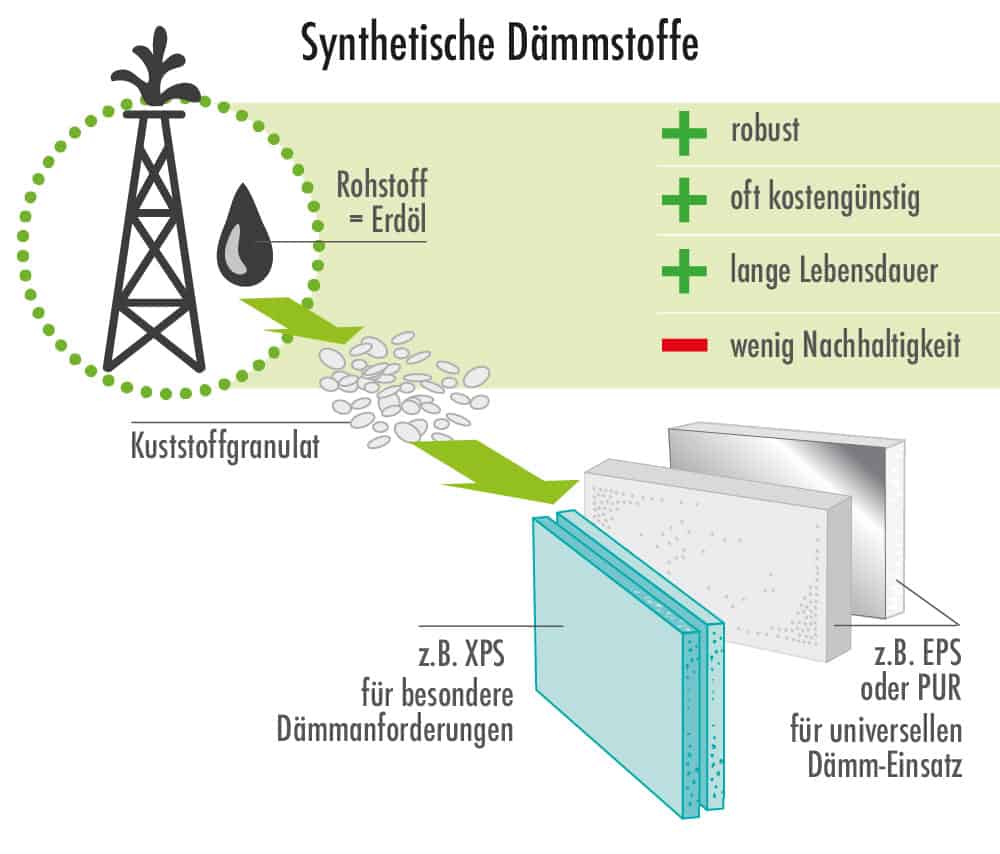 Eine Kategorie der Dämmmaterialien bilden Kunststoffe wie etwa Polyurethan und Polystyrol, die auf Erdöl basieren. Sie sind günstig in der Anschaffung, robust und feuchtigkeits- sowie verrottungsresistent. Zu den bekannten Vertretern dieser Gruppe gehören EPS, XPS und PU; weiterhin zählen Aerogelmatten, Vakuum- und Phenolharzplatten zu den synthetischen Dämmstoffen.