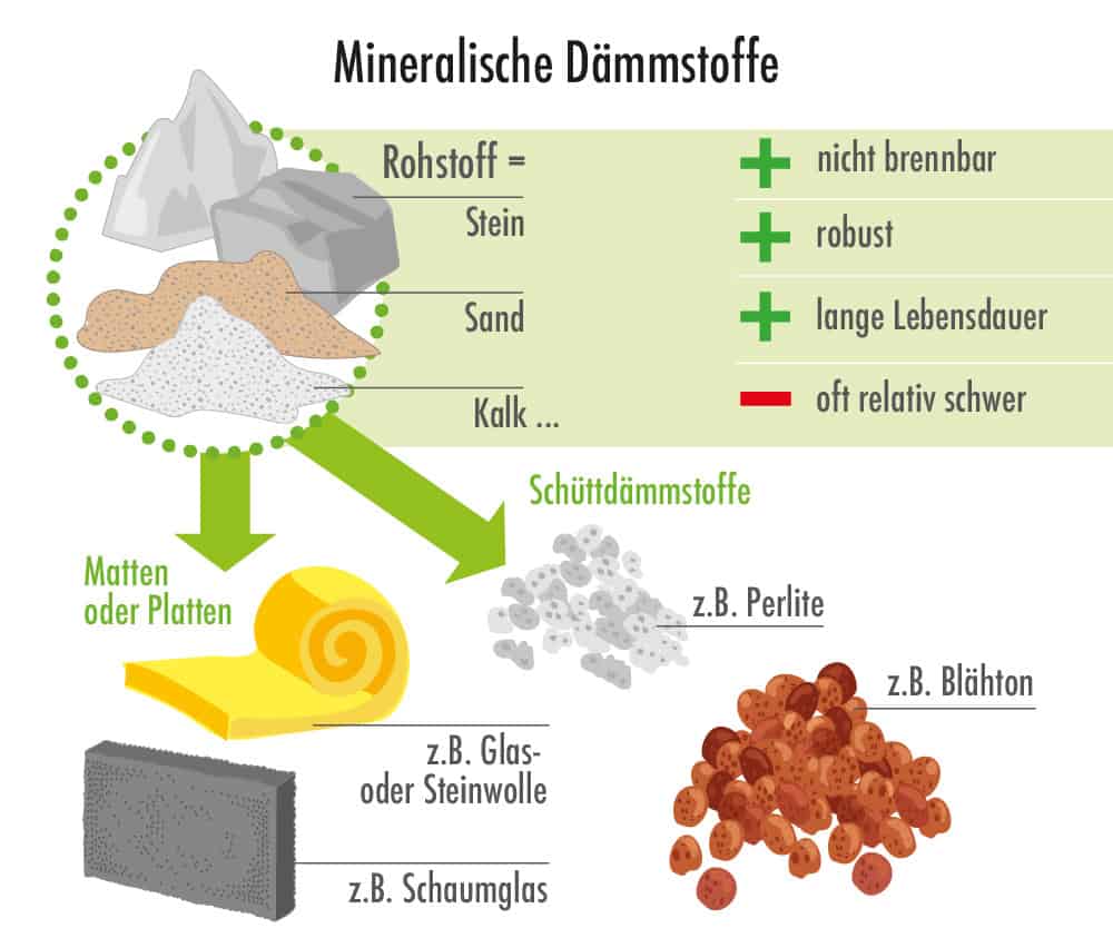 Anorganische Materialien wie Sand, Stein, Vulkangestein, Altglas und Kalk sind die Ausgangsstoffe, aus denen mineralische Dämmmaterialien wie Glas- und Steinwolle, Schaumglas, Perlite, SLS 20, Calciumsilikat und Mineraldämmung hergestellt werden. Zu ihren Pluspunkten zählen unter anderem ihre hohen Dämmwerte, ihre guten Brandschutzeigenschaften und ihr positiver Einfluss auf das Raumklima.