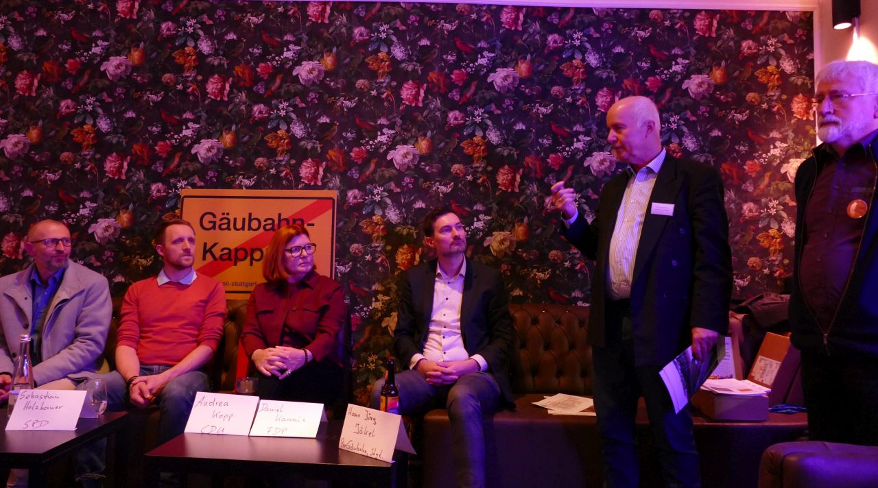 Alle vier Kandidaten sprachen sich eingangs für den Erhalt der Gäubahn aus, aber die Vorstellungen über das Wie gingen dann doch weit auseinander. Eine Kappung in Vaihingen sei zudem wegen der Gleiskonstellationen und dadurch langen Umstiegs-Wegen bis zu 20 Minuten, für Ältere und Behinderte schlichtweg nicht machbar. Die Alternative bleibe also, die Gäubahn auf der Panoramastrecke weiterhin in den Hauptbahnhof oberirdisch einfahren zu lassen, so Befürworter des unterbrechungsfreien Erhalts der Gäubahn.