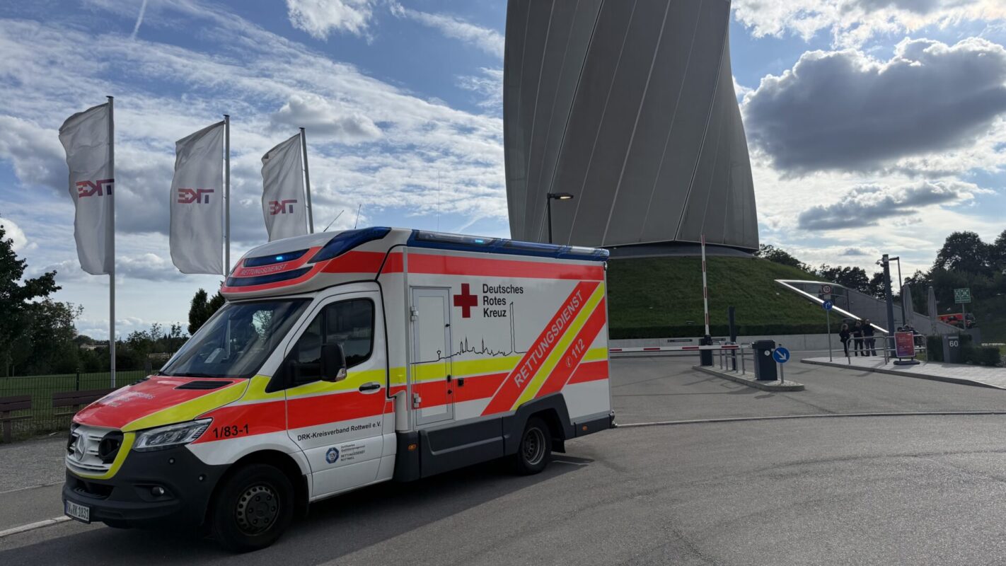Wie der Sprecher der Rottweiler Feuerwehr André Wendel mitteilte, befindet sich der Brandmelder, der den Alarm gegeben hat, im 14. Stock des Gebäudes – und damit etwa der Hälfte. Wegen der zunächst unklaren Lage ließ die Feuerwehr die Besucherplattform räumen. Die Menschen, die sich dort aufhielten, konnten allerdings nicht den Besucheraufzug nutzen. Sie mussten das Treppenhaus nehmen, die Aufzüge sind im Brandfall gesperrt, so Wendel. 42 Menschen seien so nach draußen gelangt und haben sich im Bereich der Pforte gesammelt. Dort trafen sie auf das Team des DRK, das sie medizinisch betreute. Verletzte aber gab es nach aktuellem Stand glücklicherweise nicht. TKE-Mitarbeiter reichten Getränke. Der Abstieg durchs Treppenhaus von der Besucherplattform aus dauert etwa 20 Minuten, schätzte der Feuerwehrsprecher.