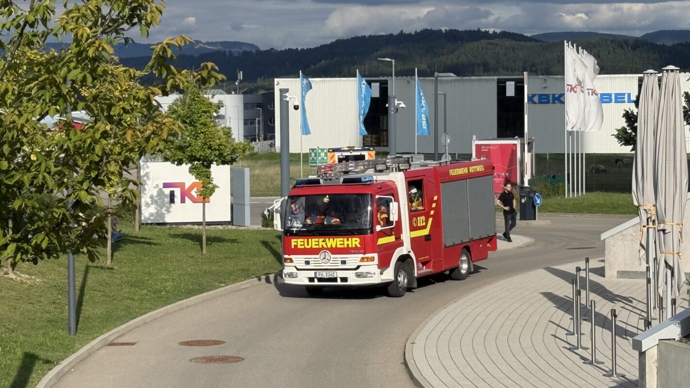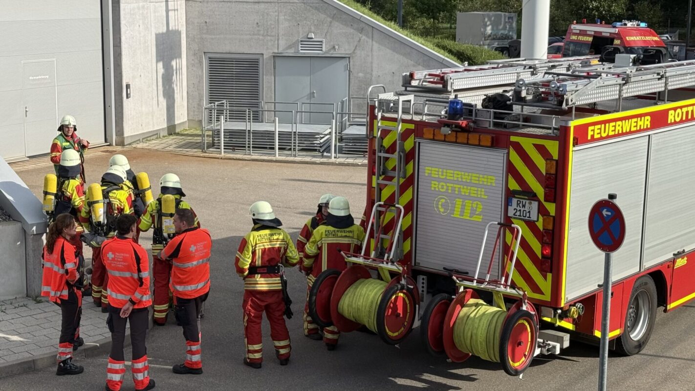 Mit sechs Fahrzeugen und einer Vielzahl an Einsatzkräften rückte die Feuerwehr Rottweil am Samstag zum TKE-Testturm für Hochgeschwindigkeitszüge auf dem Berner Feld aus. Das DRK war mit einem Rettungswagen vor Ort. Grund: eine ausgelöster Brandmelder.