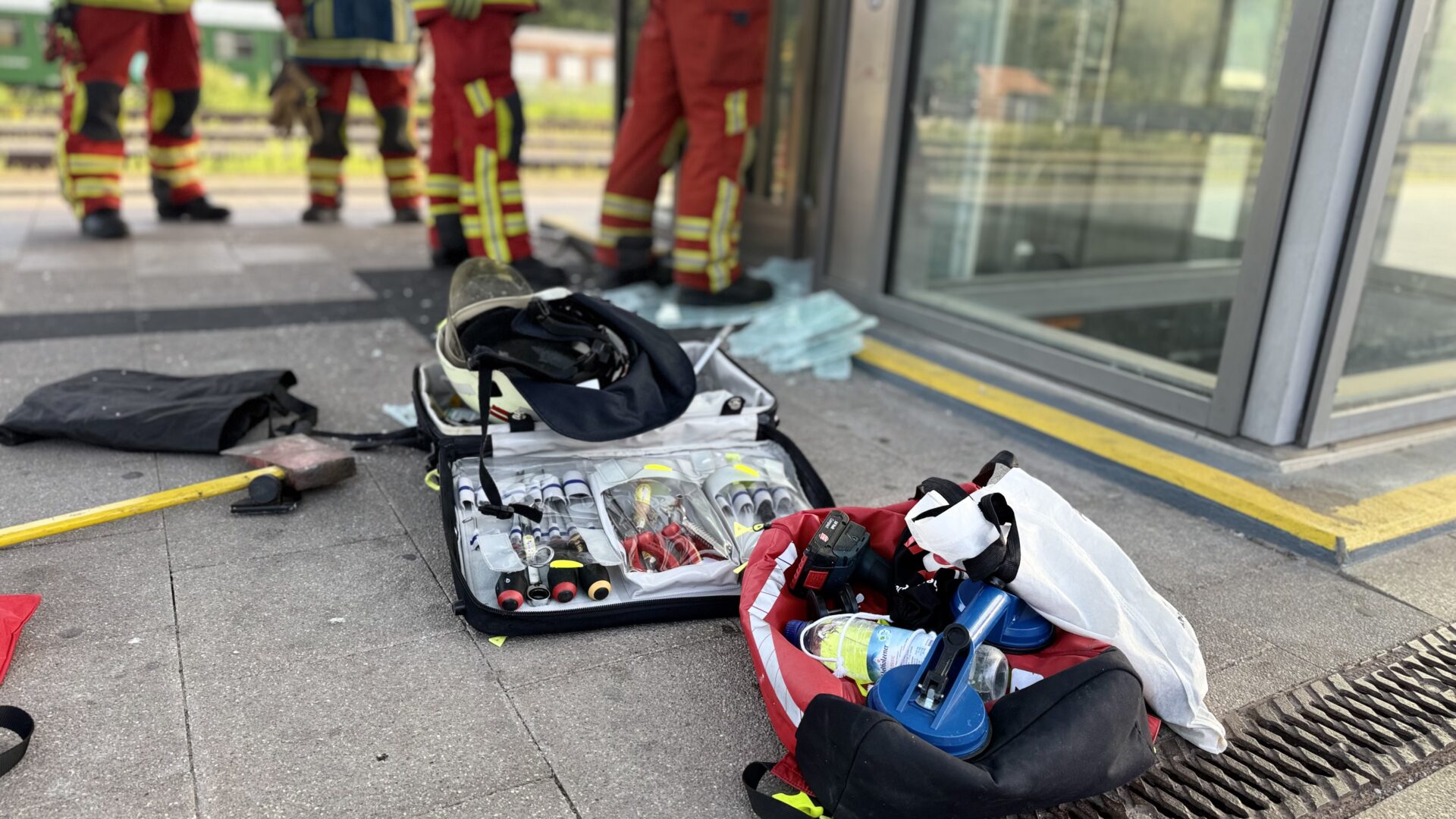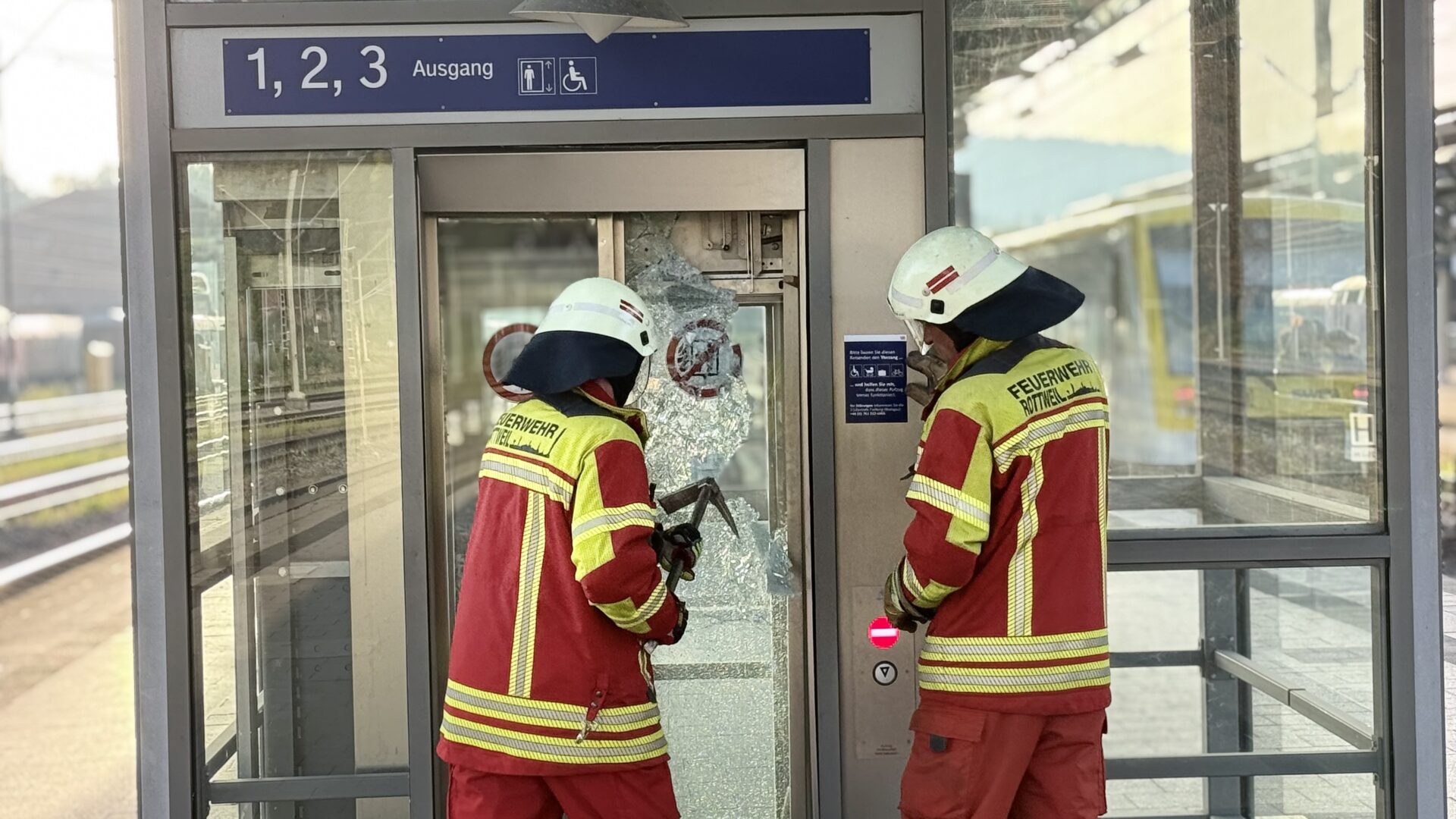 Als zudem feststand, dass die Bahn in absehbarer Zeit keinen Techniker zur Verfügung stellen würde, entschied Einsatzleiter Müller auf rohe Gewalt. „Wir haben sonst keine Möglichkeit, an den Mann ranzukommen“, sagte Müller. Der nächste IC hielt unterdessen an Gleis 5. „Wir schlagen das jetzt ein“, sagte Müller mehr zur Aufzugstür als zur Presse. Blech gab nach. Ein erster Schritt. Und das sogenannte Fensterset, mit dem man Glas aufschneiden kann, aus dem Löschfahrzeug wurde gereicht. Die Lautsprecher am Bahnhof verkündeten: „Gleis 5, bitte steigen Sie ein. Die Türen schließen automatisch. Vorsicht bei der Abfahrt.“ Und weg war auch dieser Zug. Ein Glasschneider war währenddessen am Werk, ein schleifendes Geräusch ertönte.