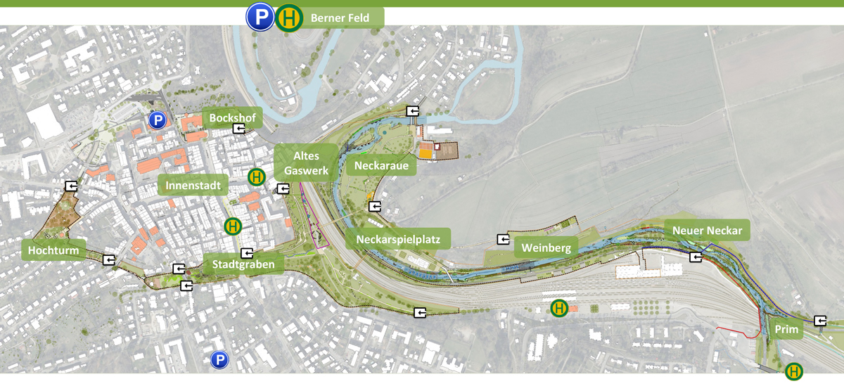 Die Haupttribüne steht auf der Fläche des alten Gaswerke – als „topfebenes Gelände“, das dafür seht gut geeignet ist. Viel Natur ist in den Neckarauen zu erfahren, beispielsweise der Beitrag „Naturschutz im Garten“. Eine „CH-apelle“ soll die Verbindung zu den Partnerstädten zeigen. In der Nähe der Königlich Privilegierten Schützengilde soll ein „Sportbeach“ mit Aktionsfläche entstehen. Nach der Gartenschau ist dort der Quartierparkplatz vorgesehen.