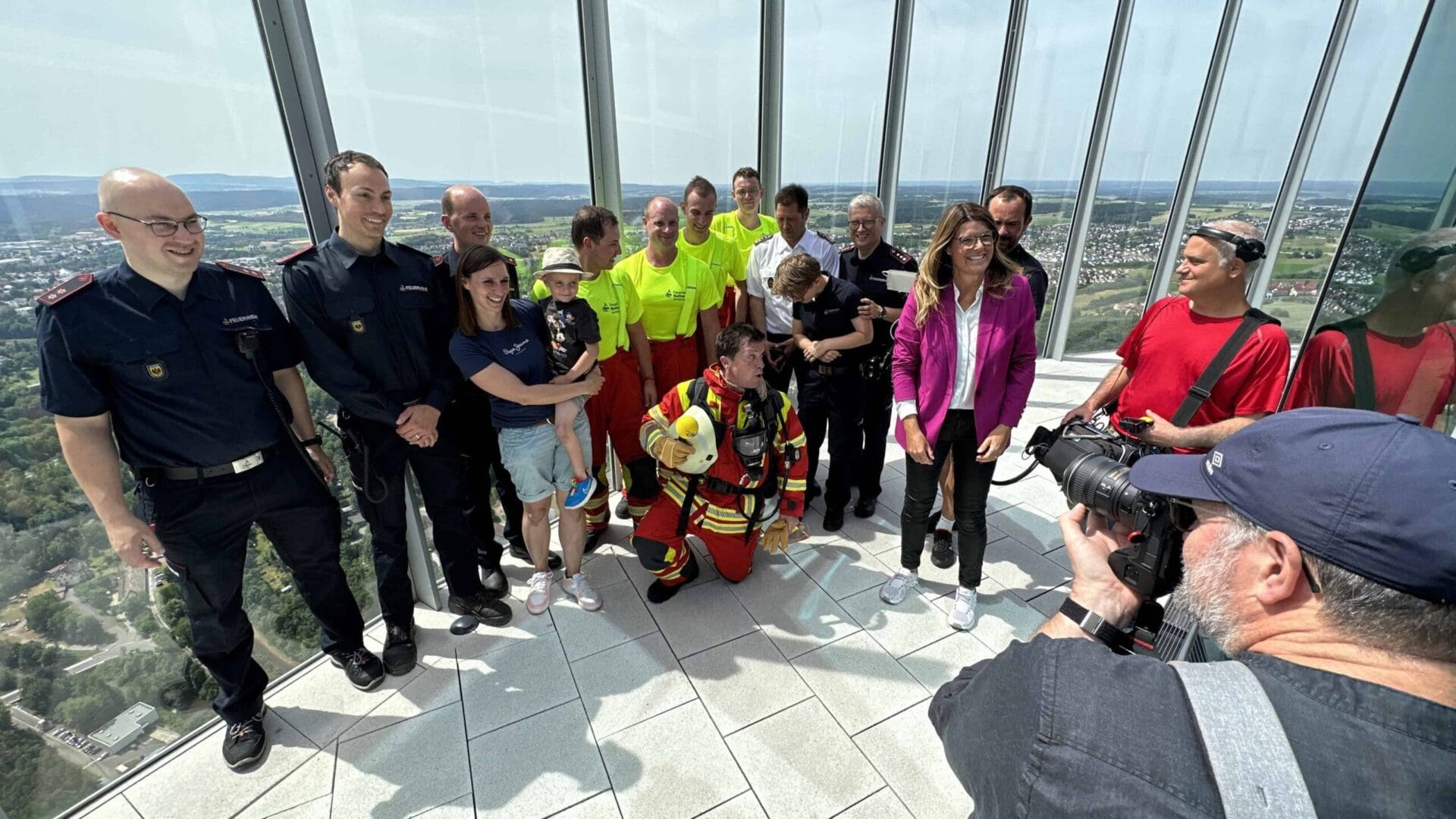 Natürlich zeigten sich die Rottweiler Feuerwehrleute, die Stadtbrandmeister Frank Müller aufgeboten hat, als auch sehr fit. So spielten sie, ein bisschen zu Showzwecken, auf der Besucherplattform schon eine Partie „Mensch Ärgere Dich Nicht“, als Weber endlich nach ihnen oben ankam. Alles übrigens sehr zur Freude von TKE-Turmmmanagerin Beate Höhnle, die sich ganz offensichtlich über die bunte Abwechslung amüsierte. Auch der kleine Theo Daute, dessen Eltern sehr aktiv sind in der Rottweiler Feuerwehr, hatte seinen Spaß.