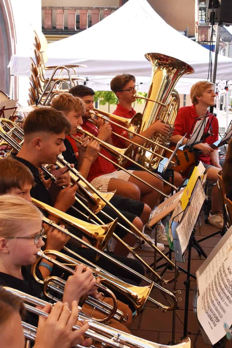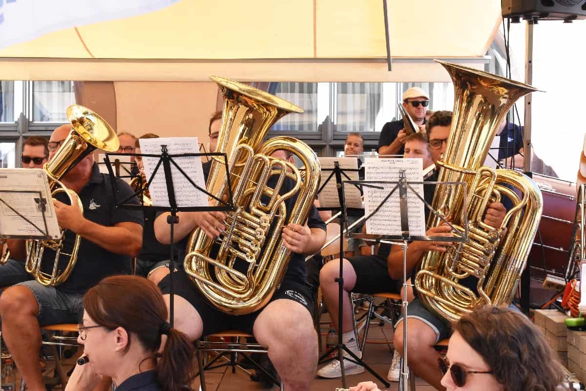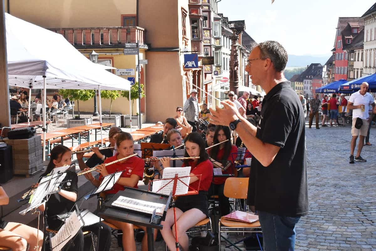 Zum „Tag der Blasmusik“ lädt die Stadtkapelle Rottweil in die obere Hauptstraße ein. Bei herrlichem Sommerwetter sind die Musikerinnen und Musiker seit 11 Uhr zugange.