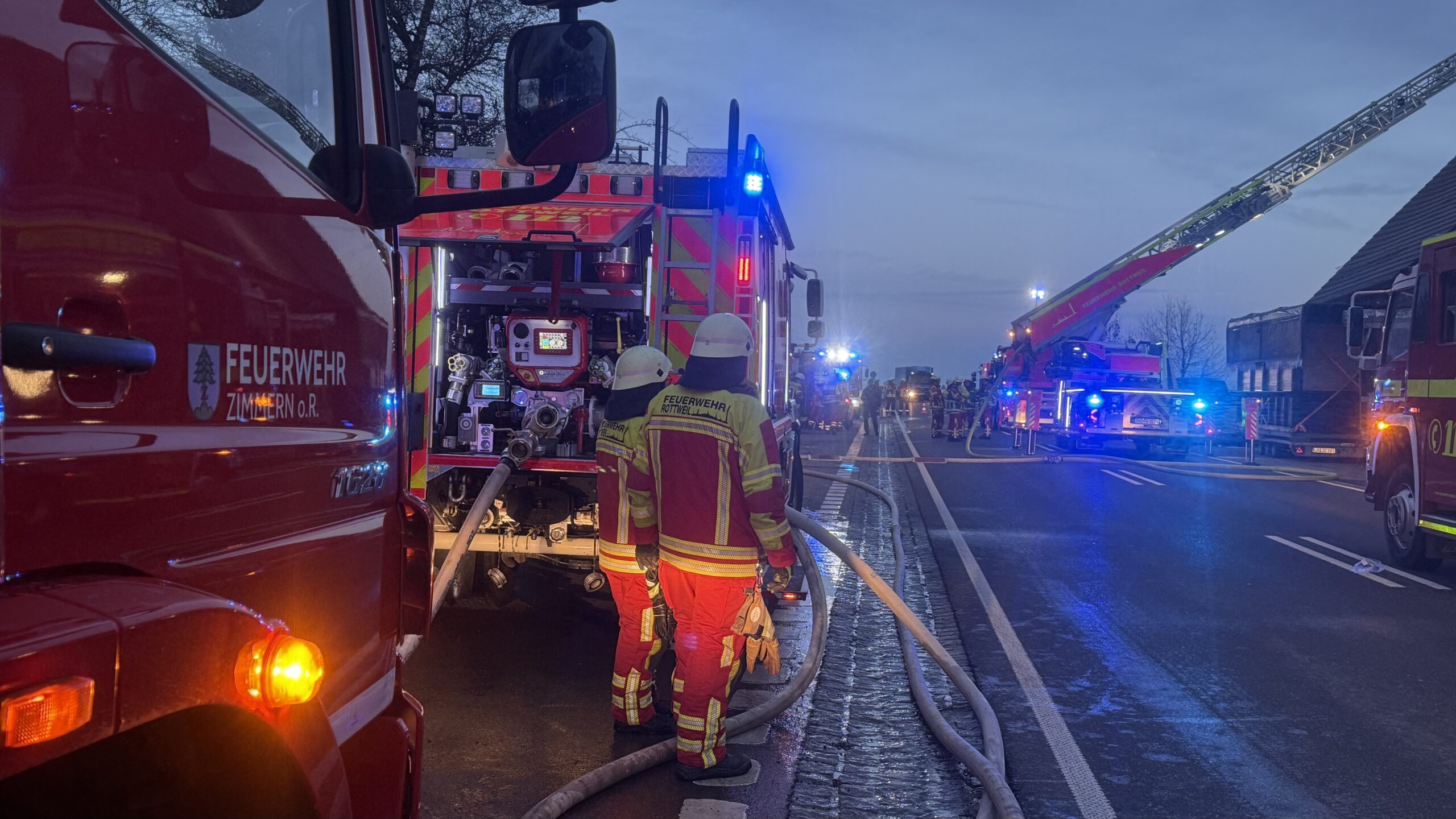 Angerückt sind die Kräfte der Feuerwehr Rottweil, die der Einsatzstelle zugeordnet sind, sowie zur Unterstützung Einsatzkräfte der Feuerwehren aus Dunningen, Villingendorf und Zimmern. Die Einsatzleitung hat Rottweils Stadtbrandmeister Frank Müller.