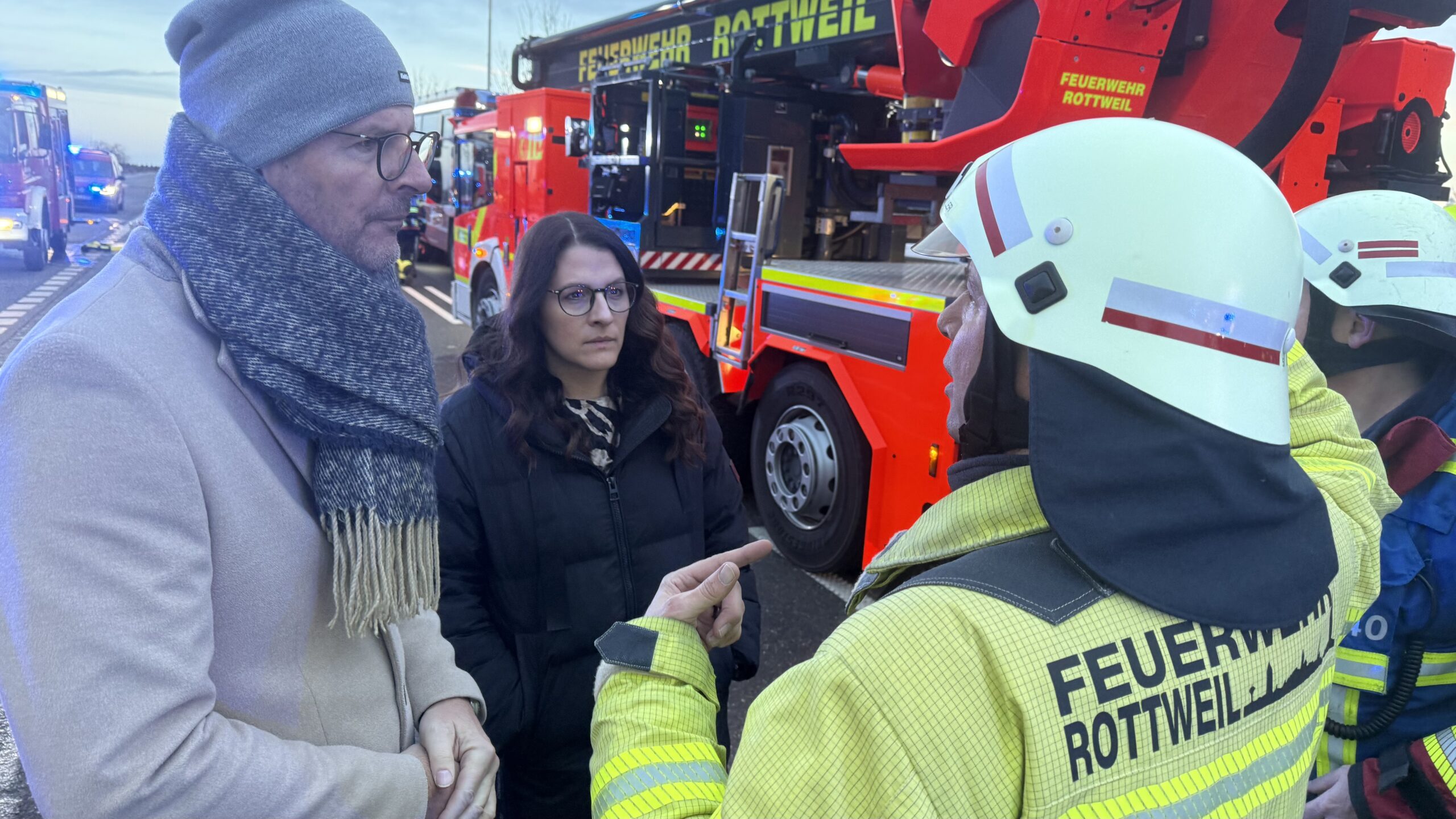 Rottweils Bürgermeisterin Ines Gaehn und Fachbereichsleiter Bernd Pfaff machten sich selbst ein Bild vor Ort. Später kam auch Rottweils Oberbürgermeister Dr. Christian Ruf hinzu. Gegen 8:20 Uhr konnte Einsatzleiter Müller die Kräfte zusammenrufen und einen Abriss über die Einsatzlage geben, der Brand war zu diesem Zeitpunkt bereits gelöscht. Eine halbe Stunde später rückten auch Kräfte der eingesetzten Feuerwehren nach getaner und abgeschlossener Arbeit ab.