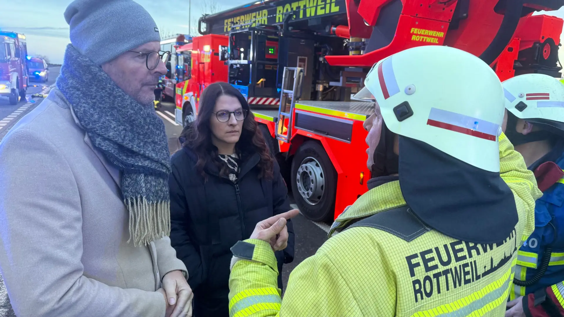 Rottweils Bürgermeisterin Ines Gaehn und Fachbereichsleiter Bernd Pfaff machten sich selbst ein Bild vor Ort. Später kam auch Rottweils Oberbürgermeister Dr. Christian Ruf hinzu. Gegen 8.20 Uhr konnte Einsatzleiter Müller die Kräfte zusammenrufen und einen Abriss über die Einsatzlage geben. Der Brand war zu diesem Zeitpunkt bereits gelöscht. Eine halbe Stunde später rückten auch Kräfte der eingesetzten Feuerwehren nach getaner und abgeschlossener Arbeit ab.