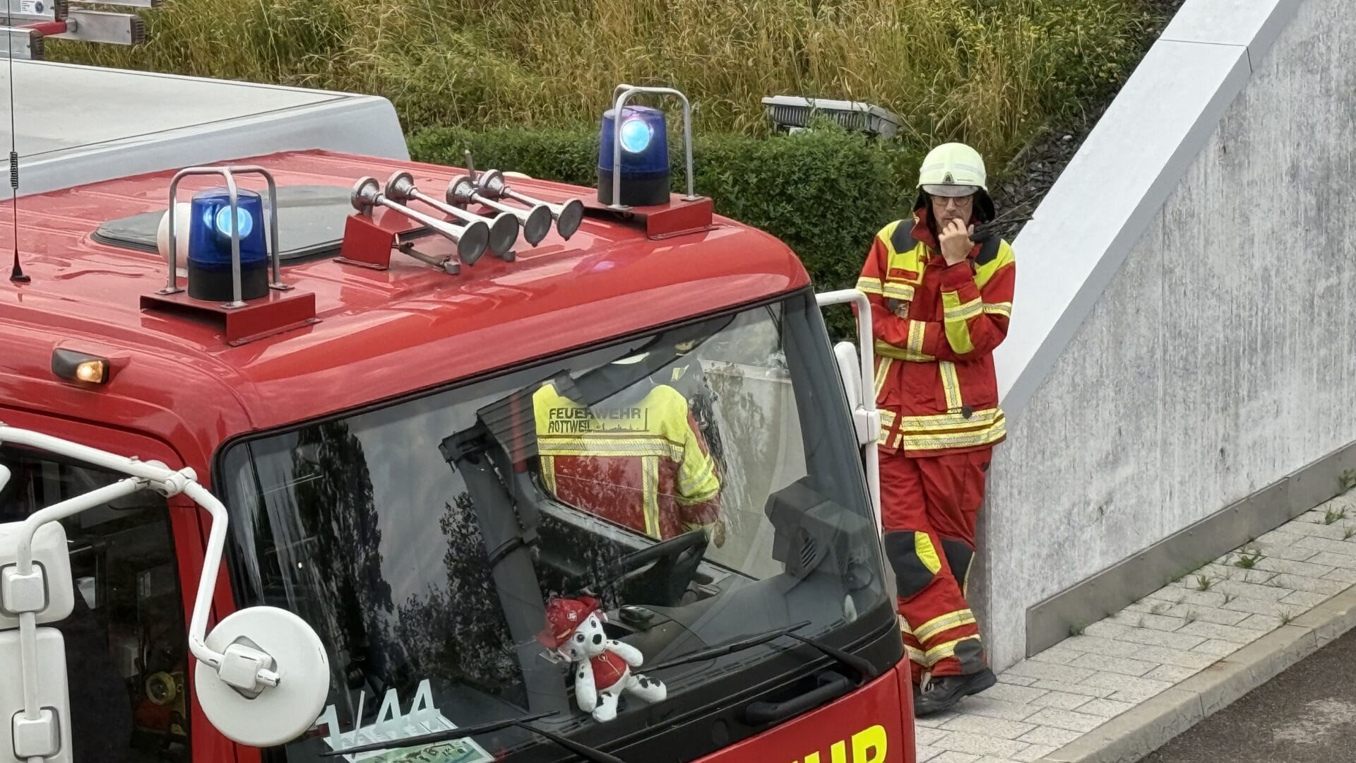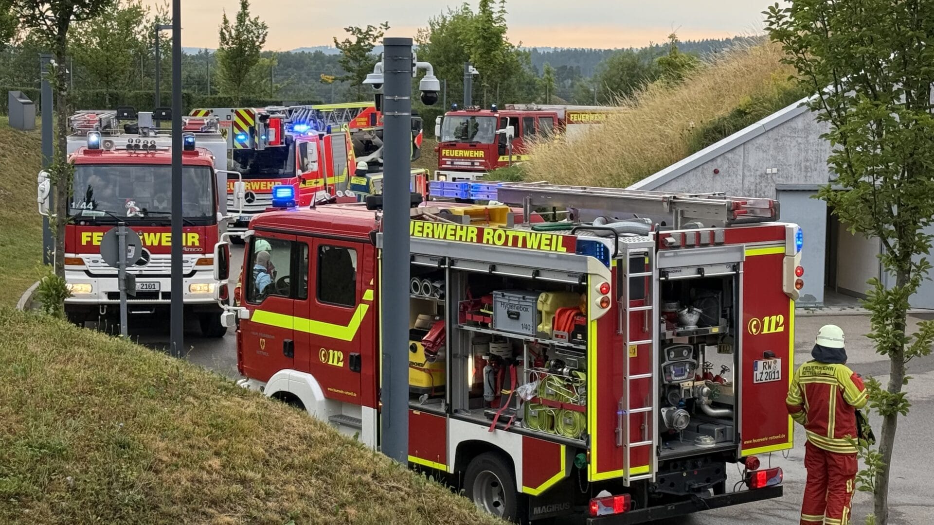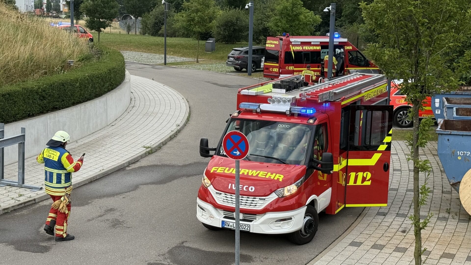 Neben einem Löschzug aus der Kernstadt waren auch Kräfte der Abteilungen Altstadt und Bühlingen im Einsatz. Zudem zur Koordination der Einsatzleitwagen aus Göllsdorf – der sich etwa auch in den gebäudeeigenen Funk einklinkt, um die Abläufe vor Ort mit zu steuern und den Einsatzleiter zu unterstützen.