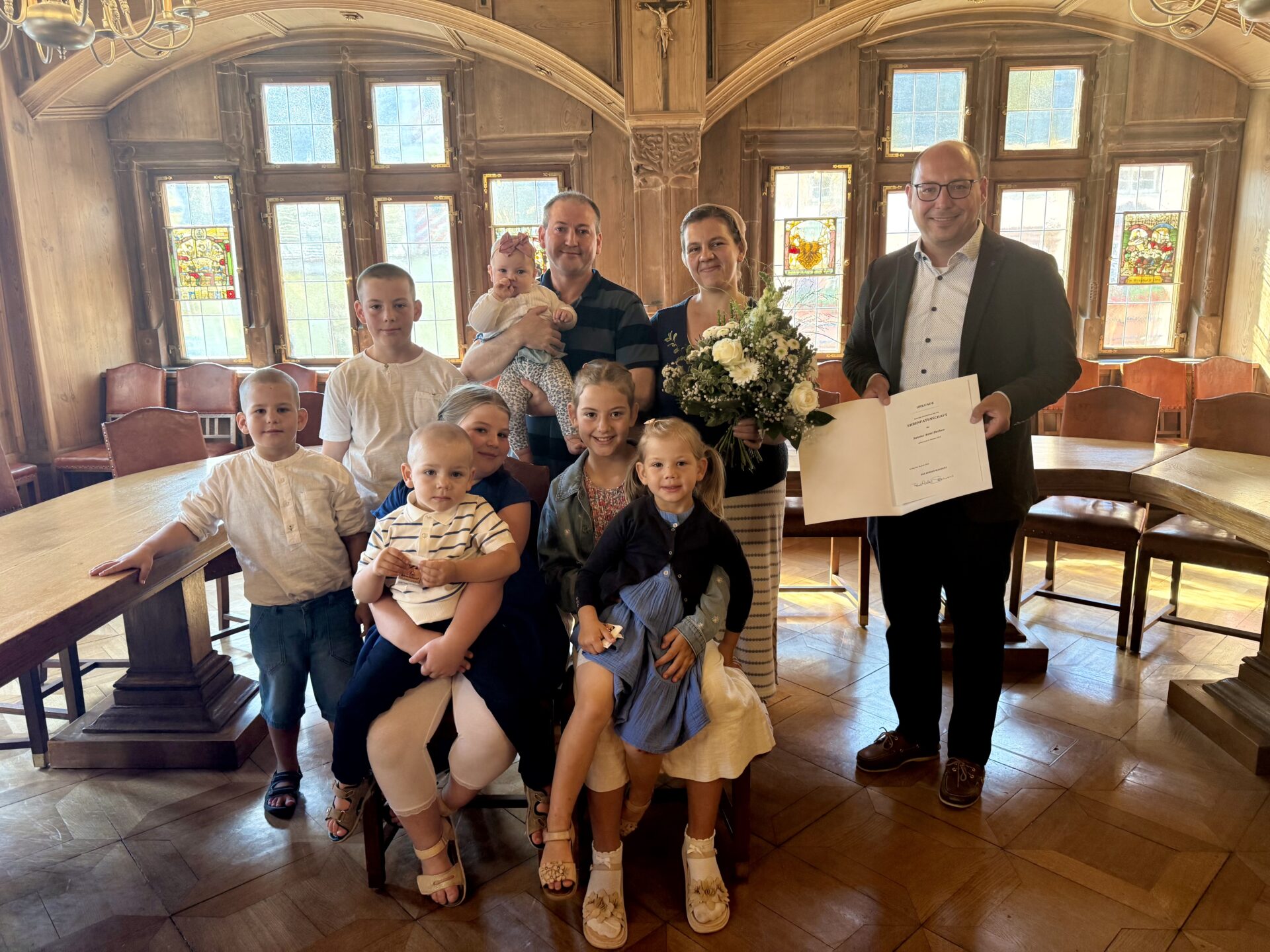 „Es ist mir eine große Freude und Ehre, im Namen des Bundespräsidenten diese besondere Patenschaft zu überreichen. Sie soll Dank und Ermutigung für das wertvolle Engagement der Eltern sein, die mit viel Herzblut Verantwortung für ihre große Familie übernehmen“, sagte Oberbürgermeister Dr. Christian Ruf bei der Übergabe. Dies berichtet die Stadtverwaltung in einer Pressemitteilung.