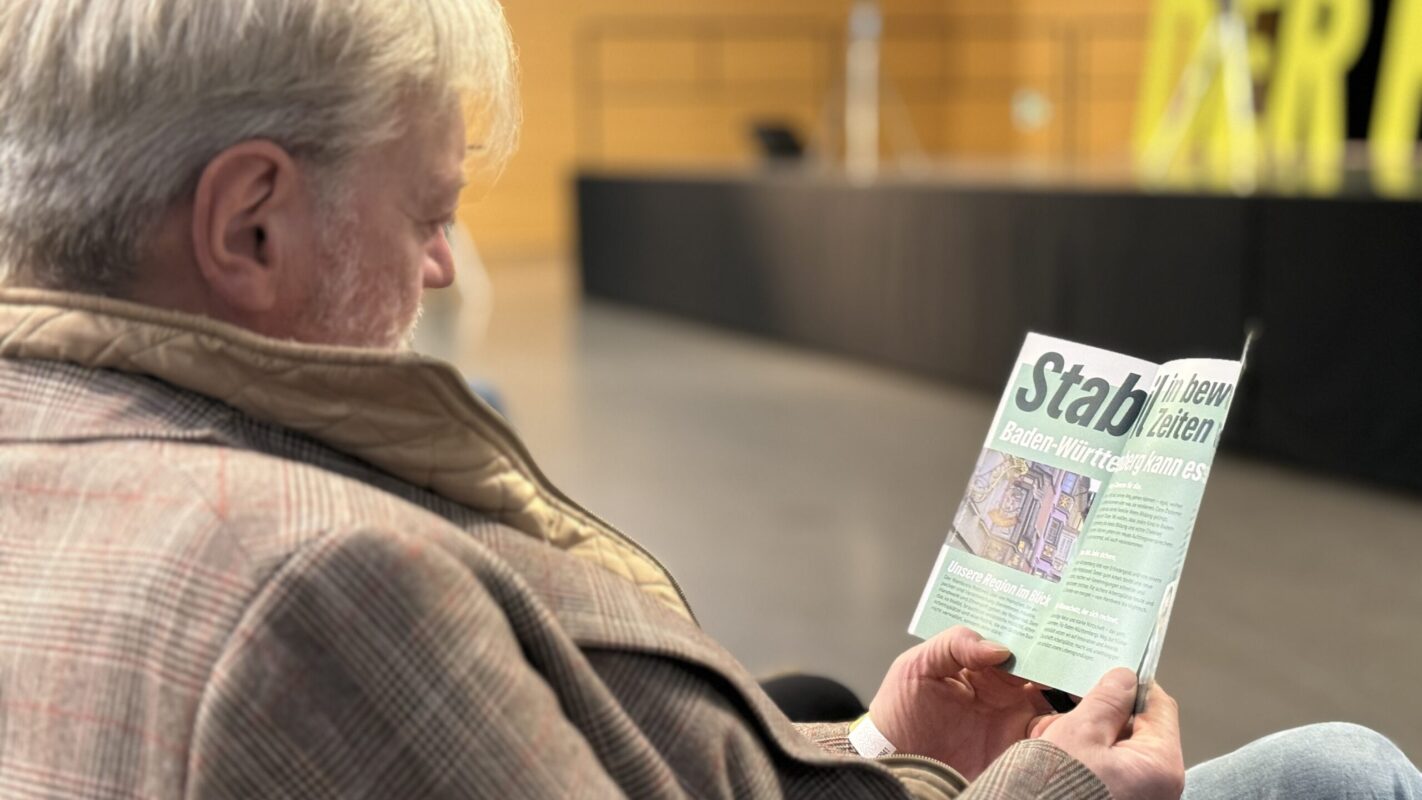 Die sitzend bei der heutigen Bestuhlung 700 Menschen fassende Rottweiler Stadthalle ist gut zur Hälfte gefüllt und es ist noch Zeit bis zum Beginn der Wahlveranstaltung. Der Veranstaltungsort ist ob seines Fassungsvermögens ambitioniert gewählt – die Location am Vorabend fasst sitzend je nach Bestuhlung nur bis zu 300 Menschen.