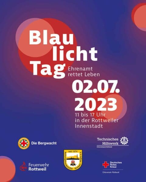 Rottweil. Unter dem Motto „Ehrenamt rettet Leben“ findet am heutigen Sonntag, 2. Juli, ein großer Blaulichttag in Rottweil statt – der erste seiner Art. Die ehrenamtlichen Blaulichtorganisationen stellen sich und ihre Arbeit zwischen 11 und 17 Uhr vor. Bis 18 Uhr läuft zudem der verkaufsoffene Sonntag des örtlichen Gewerbe- und Handelsvereins. Es ist also eine Menge los in Rottweil. Das komplette Programm ist weiter unten zu finden.