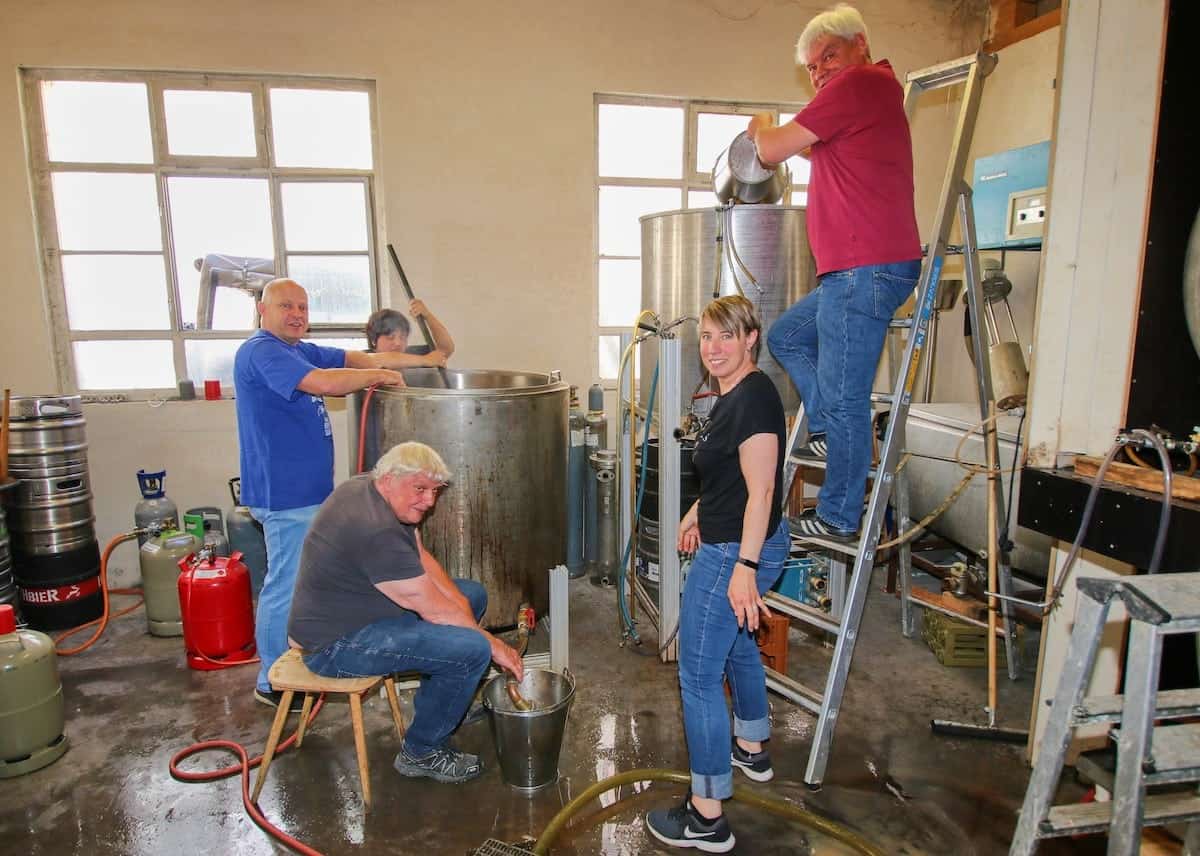 Es besteht aus Wasser, 75 kg Gerste, 3 kg Münchner Malz und Tettnanger Hopfen. Rainer Prinzing und Holger Rabenstein sind die Fachleute, ihnen zur Seite stehen die Kirchengemeinderäte Anabel Hezinger, Markus Hudelmaier und Ulrike Kammerer. In der entscheidenden Anfangsphase hat auch Pfarrer Timo Weber vorbeigeschaut. Holger Rabenstein vermerkt den Sudverlauf in einem Protokoll.