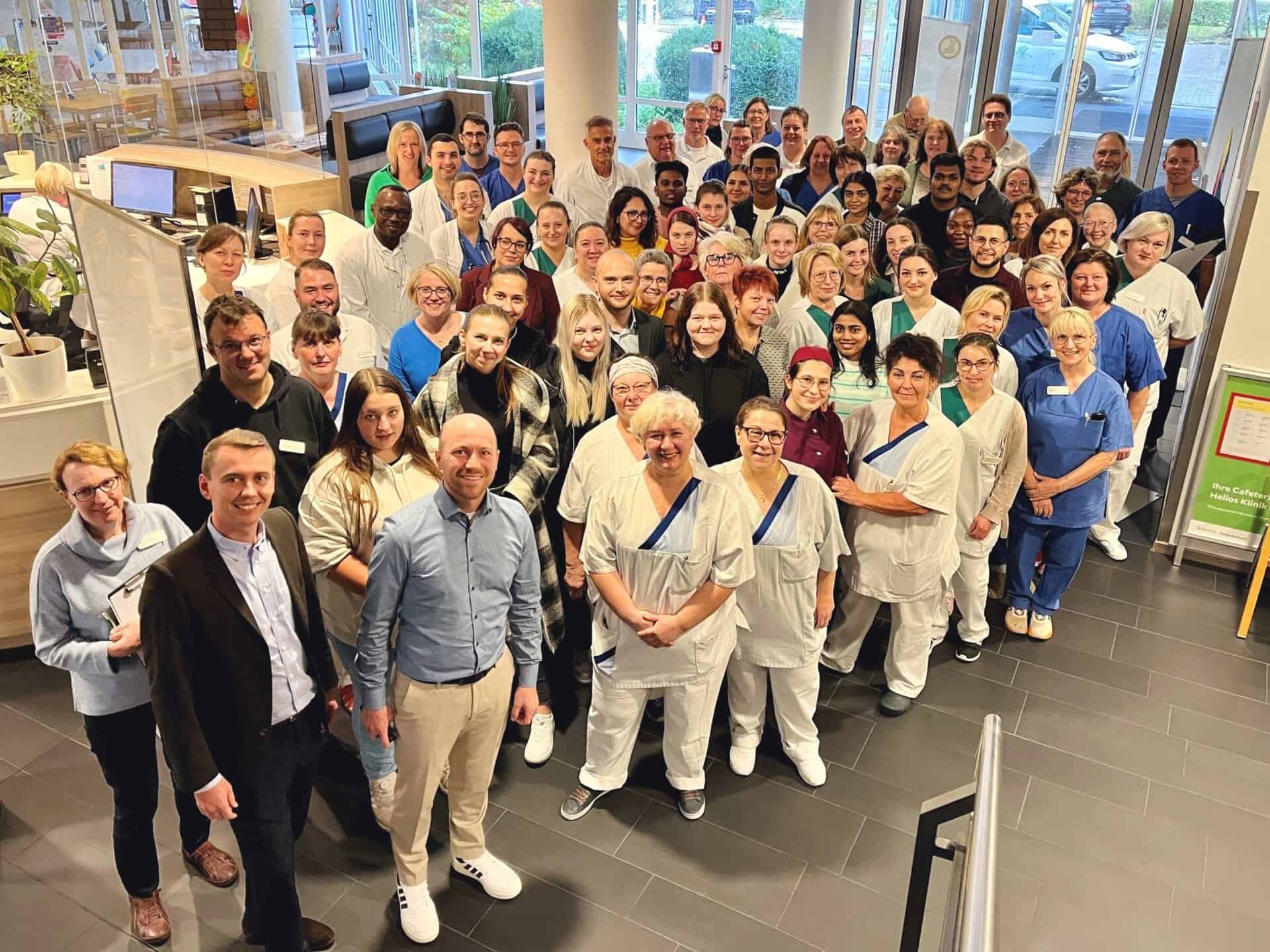 Wir – das sind 450 Menschen aus der Region. Manche sind schon seit Jahrzehnten im Haus, seit 20, 30, 40 Jahren! Und wir möchten auch weiter wachsen. Denn wir machen gute Medizin, und unsere Teams geben jeden Tag ihr Bestes – trotz der schwierigen Rahmenbedingungen im Gesundheitswesen in Deutschland, trotz des Fachkräftemangels, der selbstverständlich nicht wegzudiskutieren ist.