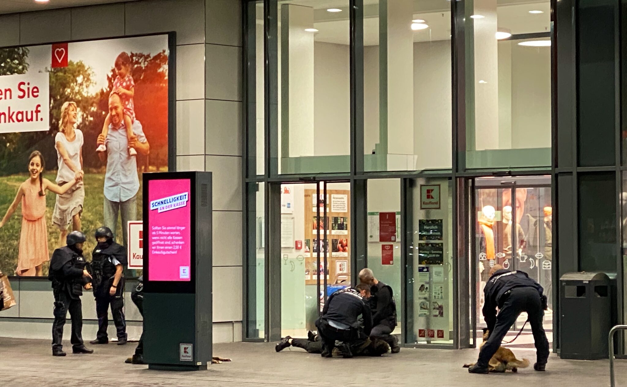 Kunden durften ab etwa 20 Uhr das Einkaufszentrum nicht mehr betreten, wurden weggeschickt. Die Beamten postierten sich auch mit zwei Polizeihunden links und rechts des Eingangs.