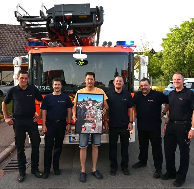 Müller befand sich zum Zeitpunkt, als das Foto gefertigt wurde, in Südtirol im Urlaub und war nach seiner Rückkehr am vergangenen Samstag völlig überrascht, als ihm eine Delegation der Feuerwehr Rottweil das Foto als Geschenk überreichte, so Mack.