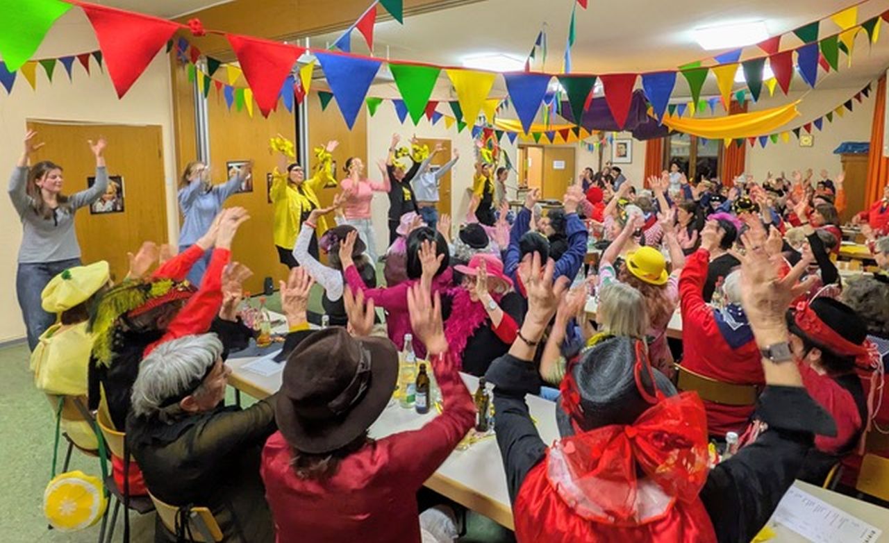 Die Gute Laune wurde doppelt gefeiert – der Party-Hit, zu Beginn mit den Damen vom Leiterteam und dann von allen im Saal, mit Zugabe. Die Spittelmuck, alias Rita Rimpp, brachte eine Weile Besinnlichkeit, gepaart mit Dankbarkeit und auch Glückseligkeit ins Gemeindehaus.