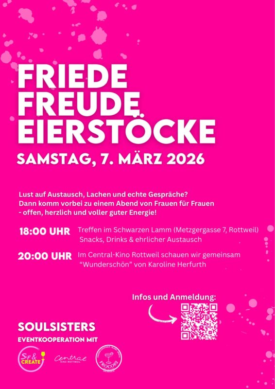 Rottweil – Unter dem Motto „Friede, Freude, Eierstöcke“ laden am Samstag, 7. März 2026, Frauen zu einem besonderen Abend in den Kulturbesen „Schwarzes Lamm“ in der Metzgergasse 7 ein. Willkommen sind alle Frauen, die Lust auf einen entspannten Abend in lockerer Runde mit Snacks, Drinks und offener Gesprächsatmosphäre haben.