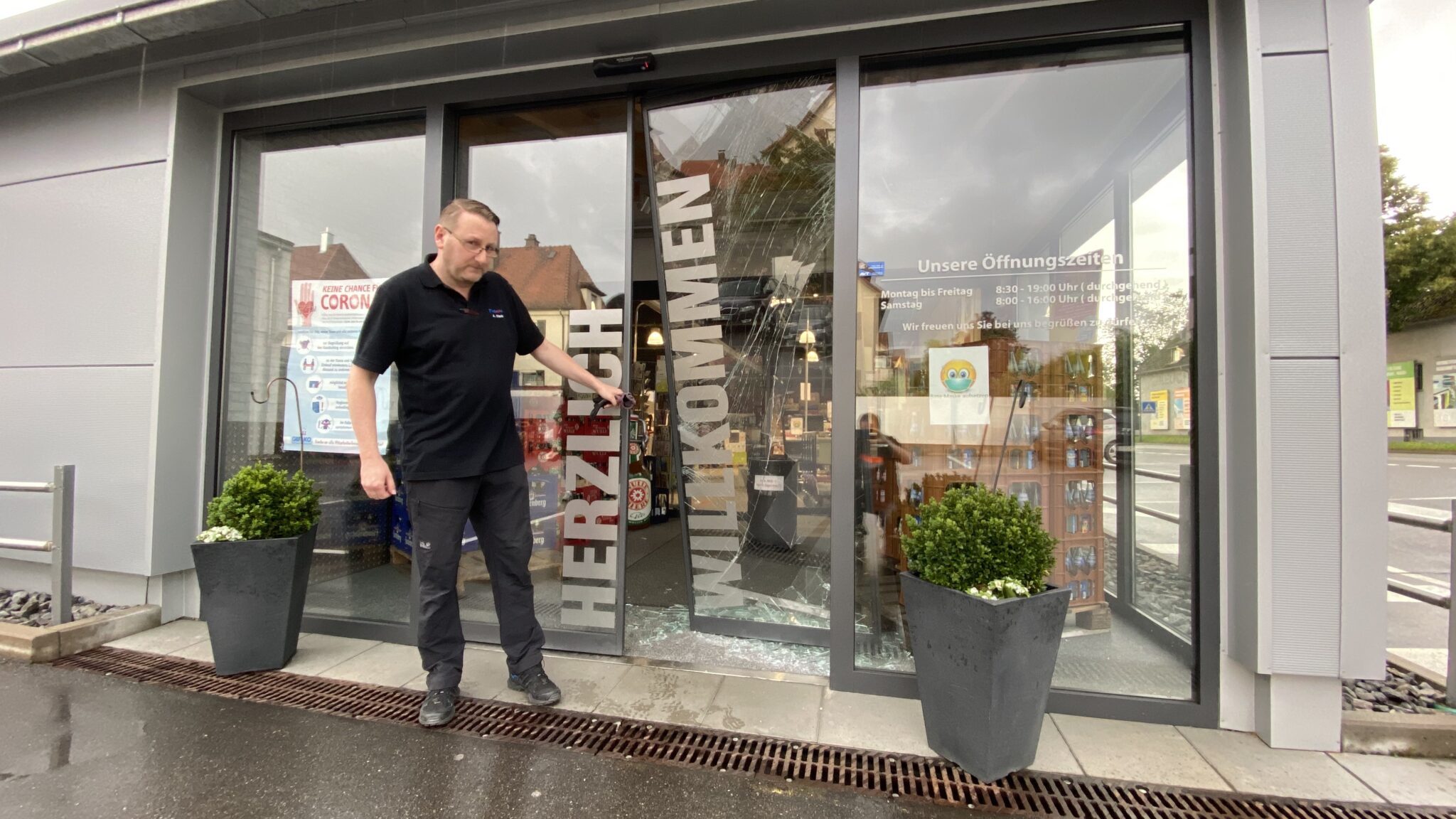 Dort fand er die Eingangstüren zerstört vor, mit Gewalt aufgestemmt. Glas liegt herum, ein Spalt ist entstanden, zum Durchschlüpfen. „Herzlich Willkommen“, steht auf den Türen, doch so ist das nicht gemeint.