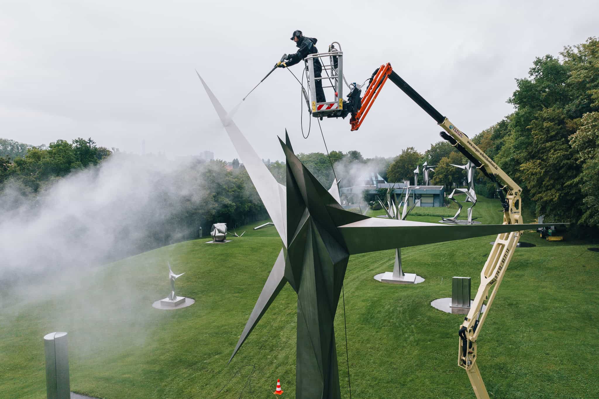 Die größeren Skulpturen mit einer Höhe von bis zu 17 Metern werden im Anschluss von einem mobilen Hubsteiger aus gereinigt. Parallel arbeitet ein zweites Team vom Boden aus und reinigt die Werke bis zu einer Höhe von drei Metern. In der Höhe kommt Heißwasser-Hochdruckreinigung zum Einsatz. Das Team am Boden arbeitet mit Kaltwasser-Hochdruckreinigern.