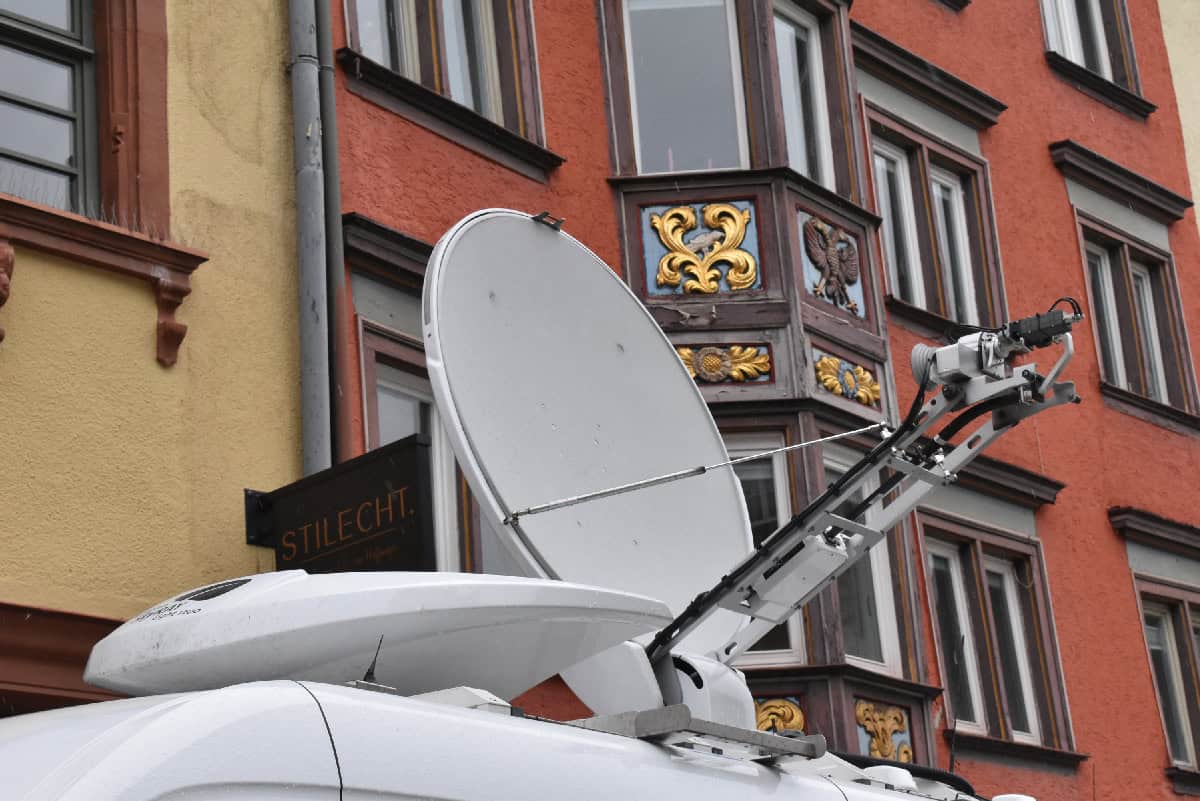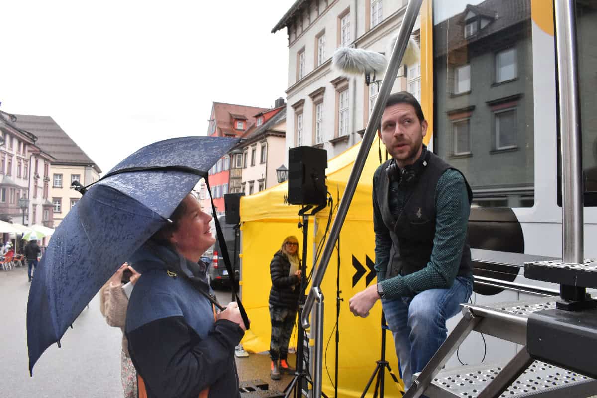 Stefanie Anhalt und Corvin Tondera-Klein sind die ganze Woche mit dem mobilen Studio unterwegs. Rottweil ist nach Bruchsal und Gengenbach die dritte Station. Einiges haben sie vorbereitet – so war ein Reporter unterwegs, und mit Heinrich Del Core waren die beiden verabredet. Immer wieder durften aber Presse und Neugierige einen Blick ins Studio werfen – ein kleines Räumchen mit viel Technik und zwei Menschen. Im Normalfall.