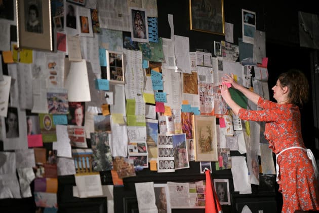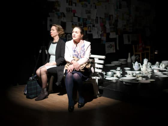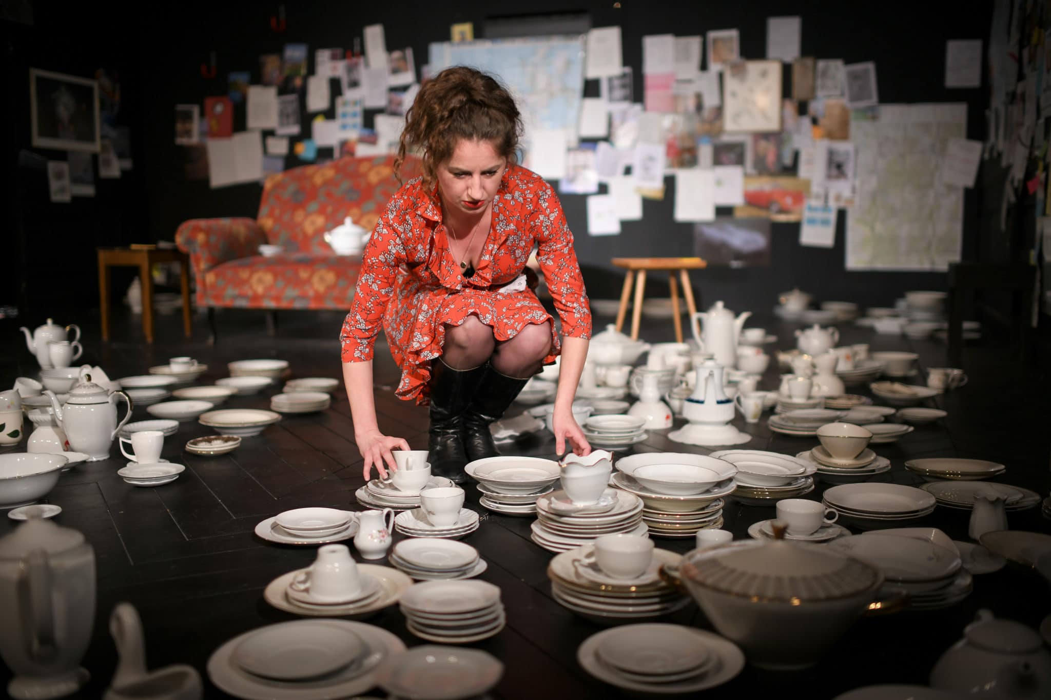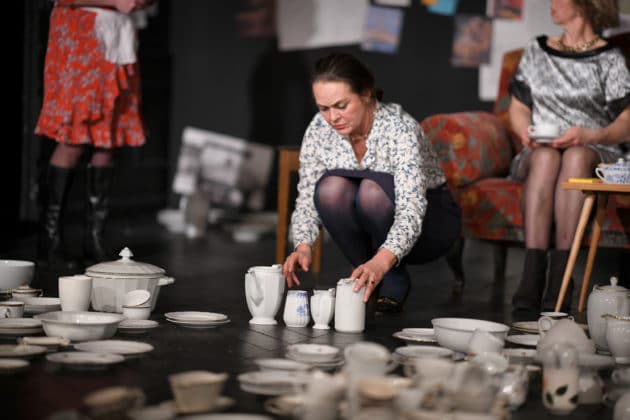 Reiche Assoziationen eröffnet zudem die Ausstattung, für die als Dramaturgin Bettina Schültke verantwortlich zeichnet: Die Wände sind mit einem Erinnerungs-Patchwork gespickt, als ob man sich im Innern von Maries Kopf befände. Ein Blickfang ist zudem der ganz von wei0ßem Geschirr übersäte Boden – halb bürgerlicher Porzellan-Schatz, halb zugemüllte Rumpelkammer. Und ein wunderbar poetisches Bild dafür, wie wir uns unser Leben zurechtlegen und was im Beziehungs-Porzellan-Laden, den jede Existenz letztlich darstellt, so alles zu Bruch gehen kann.