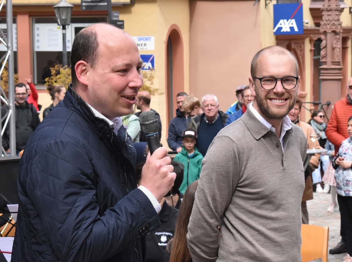 Nach vier Jahren endlich wieder Jazz in Town in gewohnter Form und ohne Einschränkungen, freute sich Busch vor gut über 200 Zuhörern. Ruf sprach seinen Dank aus an Busch, seinen Mitstreiter Claus Gams und alle die anderen Helferinnen und Helfer, die das Fest erst möglich machen. Er wünschte dem Fest, dass es nicht regnen möge. Und er stellte das traditionell zuerst auftretende Ensemble vor, die 70-köpfige Jugendkapelle der Stadtkapelle unter „Stadtmusikdirektor“ Johannes Nikol – dem ganz offiziell dieser Titel erst am 10. Mai verliehen werden soll, wenn der Gemeinderat zustimmt.