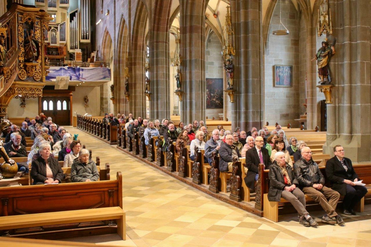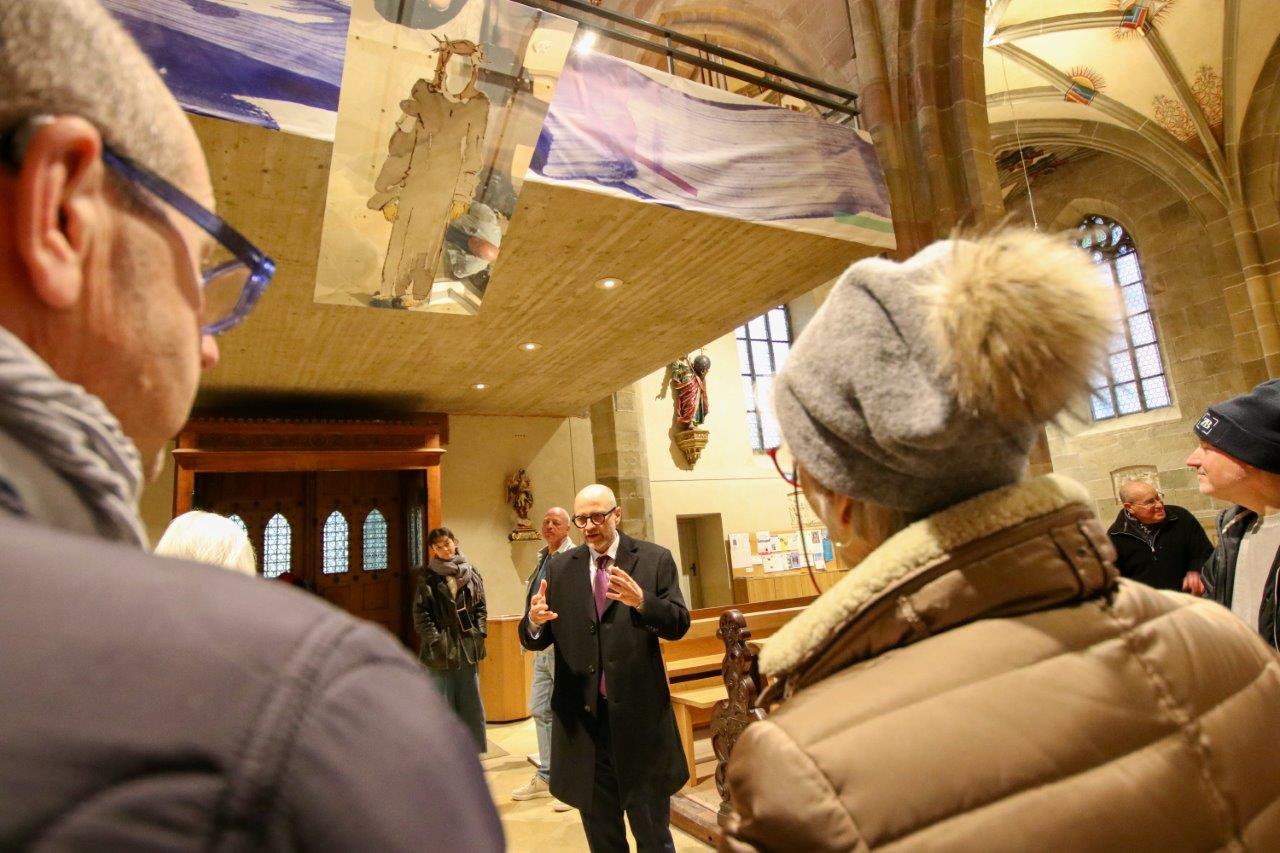 Pfarrer Timo Weber begrüßte bei der Vernissage die überaus zahlreich erschienene Gemeinde. Christian Groß umrahmte die liturgische Veranstaltung musikalisch an der Orgel. Eine Erläuterung der temporären Kreuzweginstallation gab Vikar Nico Schmid. Er referierte darüber, wie Kunst und Theologie sich gegenseitig brauchen und ergänzen. Papst Paul VI. sagte, der Kunst käme die Aufgabe zu, die Schätze aus dem himmlischen Bereich des Geistes zu erfassen und den Menschen in Worten, Farben und Formen zugänglich zu machen. Das Zweite Vatikanische Konzil sagt, die Kunst sei unbedingt ein Ort, an dem Theologie und Glaube geschehe. Kunst präge und verändere das Verhalten der Menschen. Dazu lade auch die Kreuzweginstallation von Tobias Kammerer mit der ersten Station des Kreuzweges „Jesus wird zum Tode verurteilt“ ein. Jesus steht da, vom besten Freund für dreißig Silberlinge verraten. Der Betrachter kann sich so unter den Spiegel stellen, dass sein Gesicht zum Antlitz Jesu wird. Pilatus werde vom Pöbel zur Verurteilung getrieben, obwohl er von der Unschuld Jesu überzeugt sei. Er fällt ein ungerechtes, politisches Urteil.