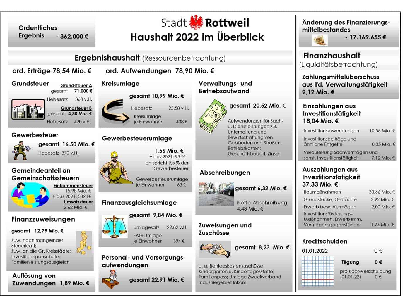 Lob für die Verwaltung, aber auch Kritik und Anregungen: Der Haushalt der Stadt Rottweil wurde im Gemeinderat einstimmig angenommen. Erträge von 78,54 Millionen stehen im Ergebnishaushalt Aufwendungen von 78,9 Millionen gegenüber – ein Fehlbetrag von 362.000 Euro. Dennoch kann kräftig investiert werden, auch ohne Schulden zu machen. Die Pro-Kopf-Verschuldung bleibt bei Null. Allerdings schmilzt das Vermögen der Stadt kräftig.