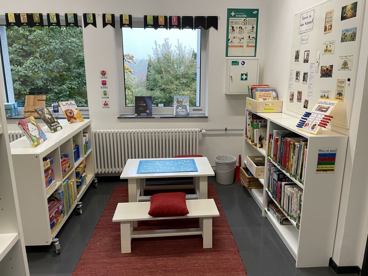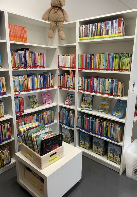 „Dank Ihrer Unterstützung konnte das Angebot unserer Schulbücherei von ursprünglich rund 400 Büchern in einem kleinen Nebenraum auf über 1200 Bücher in einem neu eingerichteten Bereich unseres Differenzierungsraums erweitert werden,“ freut sich Adriana Link, die die Bücherei mit eingerichtet hat und betreut.