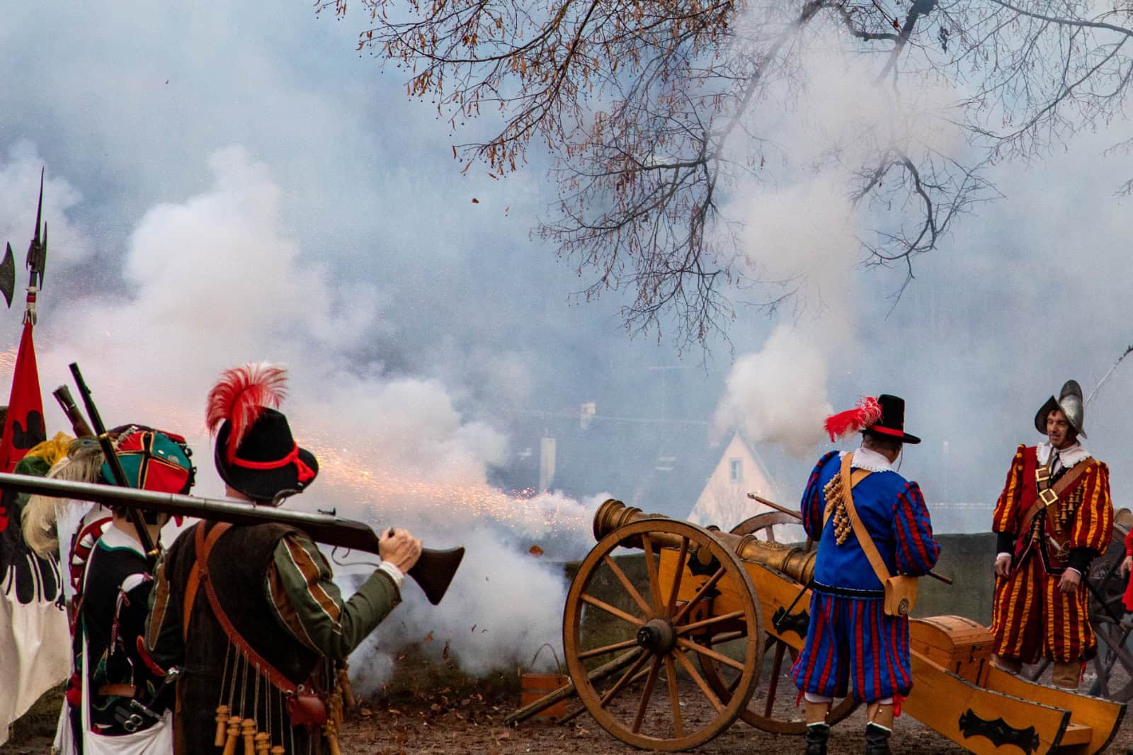 Mit lauten Donnerschlägen hat die Historische Rottweiler Bürgerwehr das Jahr 2022 (das den Meisten vermutlich ohnehin schon längst gestohlen bleiben kann) an diesem Silvester-Samstagnachmittag verabschiedet. Unter Margarete Bühner, Oberschützenmeisterin und Vorsitzende der Bürgerwehr, ließen es die Schützen und Kanoniere krachen. Sehr zur Freude der etwa 300 Menschen, die den Bockshof, wo das Spektakel wieder stattfand, bis hinauf zum Dominikanermuseum bevölkerten.